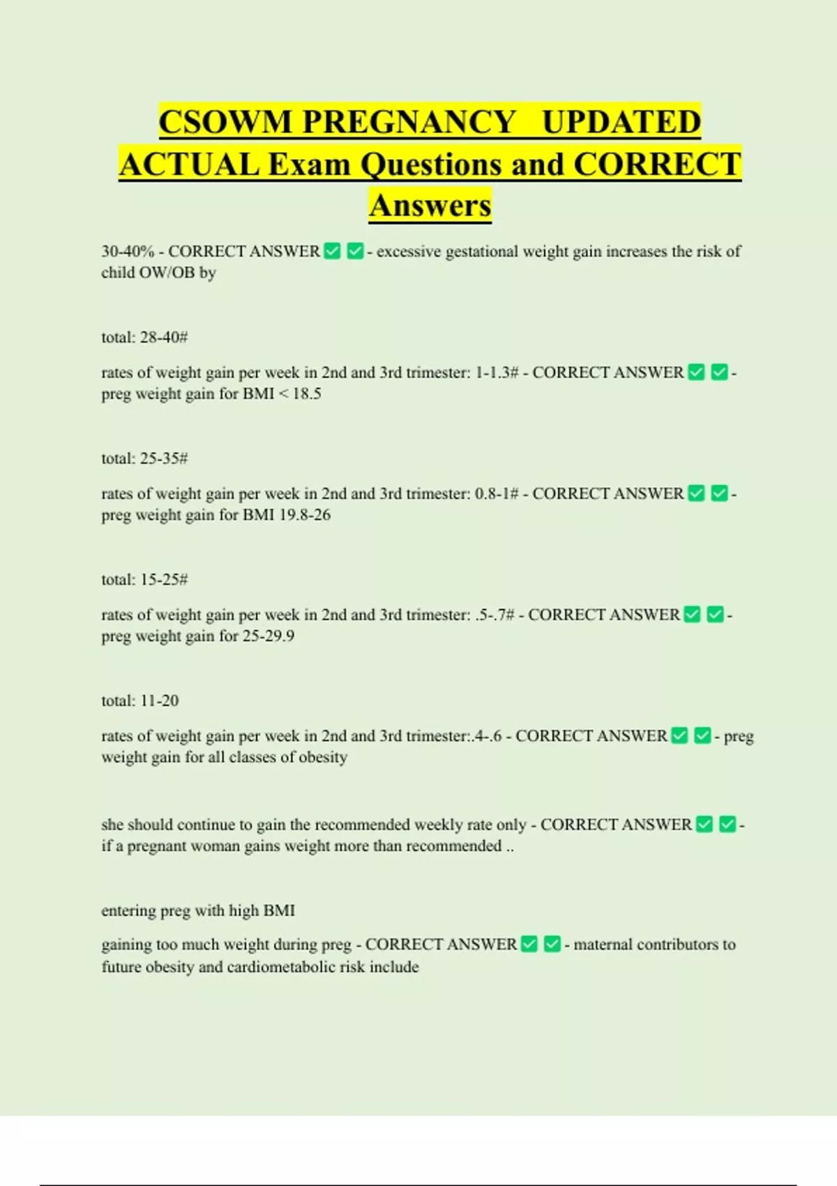 CSOWM PREGNANCY UPDATED ACTUAL Exam Questions and CORRECT Answers 30-40% - CORRECT ANSWER child OW/OB by total: 28-40# - excessive gestational weight gain increases the risk of rates of weight gain per week in 2nd and 3rd trimester: 1-1.3# - CORRECT ANSWER