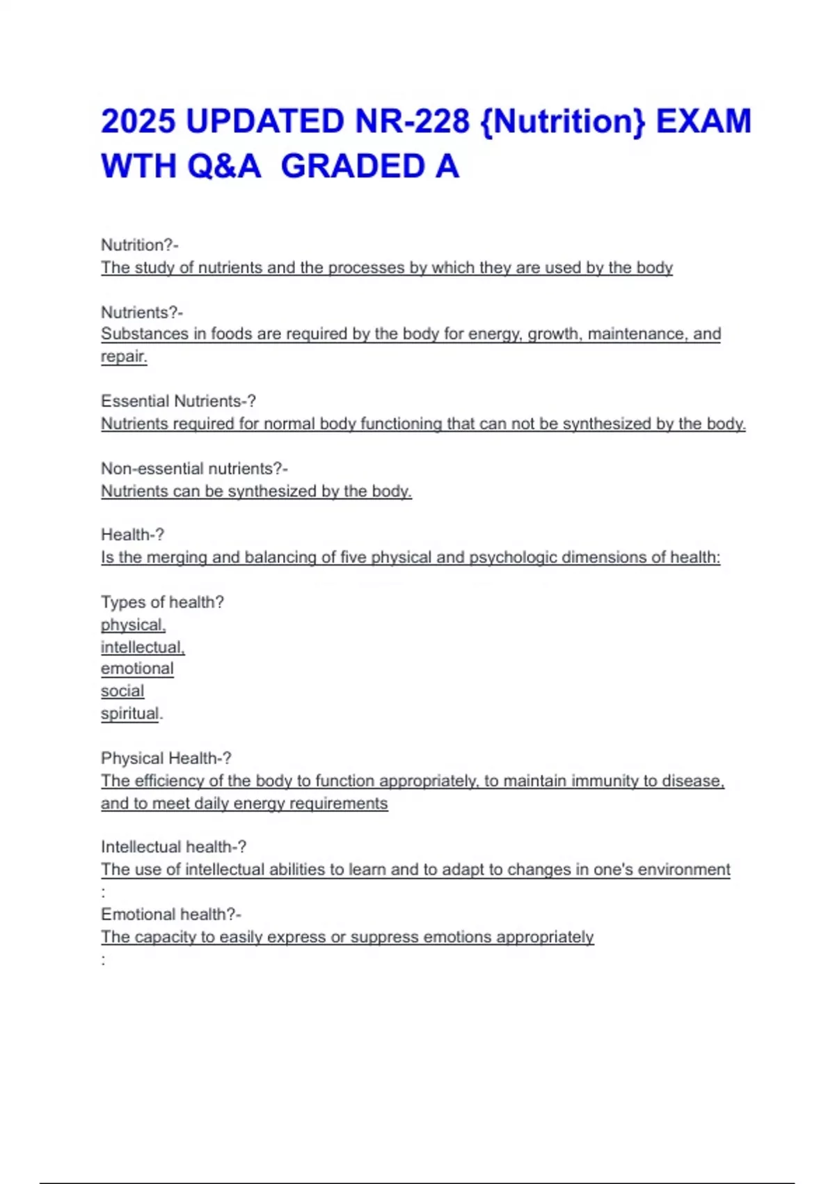2025 UPDATED NR-228 {Nutrition} EXAM WTH Q&A GRADED A Nutrition?- The study of nutrients and the processes by which they are used by the body Nutrients?- Substances in foods are required by the body for energy, growth, maintenance, and repair. Essential Nutrients-? Nutrients required for normal body functioning that can not be synthesized by the body. Non-essential nutrients?- Nutrients can be synthesized by the body. Health-? Is the merging and balancing of five physical and psychologic dimensions of health: Types of health? physical, intellectual, emotional social spiritual . Physical Health-? The efficiency of the body to function appropriately, to maintain immunity to disease, and to meet daily energy requirements Intellectual health-? The use of intellectual abilities to learn and to adapt to changes in one's environment : Emotional health?- The capacity to easily express or suppress emotions appropriately : Social health-? The ability to interact with people acceptably and sustain relationships with family members, friends, and colleagues Spiritual health? The cultural beliefs that give purpose to human existence are found through faith in the teachings of organized religions, in an understanding of nature or science, or in an acceptance of the humanistic view of life. Environmental health-? The external factors that affect our health and well-being include the physical context within which one lives and works as affected by determinants of ethnicity, education, income, and occupation, and extending to the larger environment of safeguarding natural resources to reduce exposure to preventable hazards. Wellness-? It is a lifestyle that enhances our level of health. Health promotion-? Consists of strategies used to increase the level of health of individuals, families, groups, and communities. --Knowledge --Techniques --Community support s Disease prevention-? It is the recognition of a danger to health that could be reduced or alleviated through specific actions or changes in lifestyle behaviors. Primary, secondary, and tertiary preventio n Role of nutrition? Functions of Essential Nutrients in the Body- Providing energy Regulating body processes Aiding growth and repair of body tissues Kcal value- Protein?-- 4 Kcal value- Carbs? 4 Kcalvalue- Lipids(fats)? 9 Kcal Value?- Alcohol 7 Carbohydrates-? Organic compounds composed of carbon, hydrogen, and oxygen in the form of simple carbohydrates or sugars Source of energy, sweetness, and dietary fiber