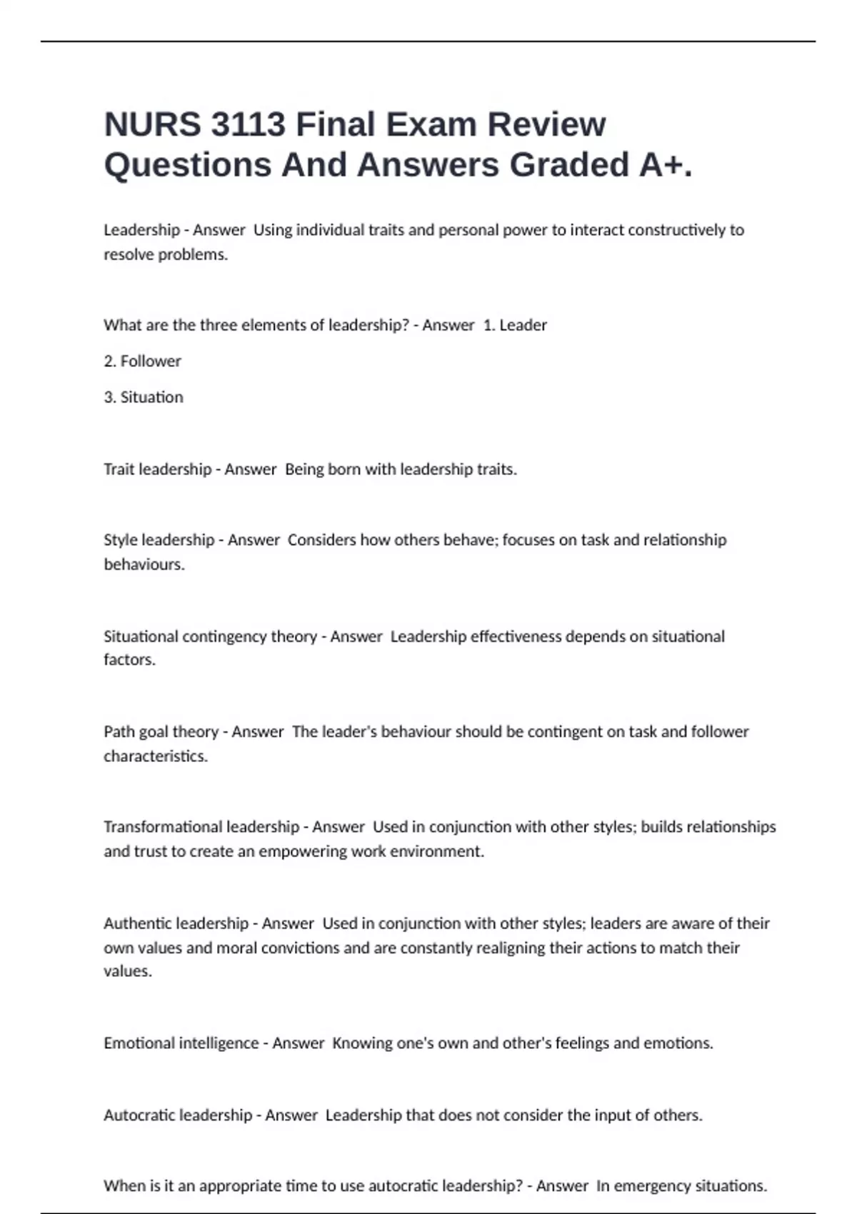 Leadership - Answer Using individual traits and personal power to interact constructively to resolve problems. What are the three elements of leadership? - Answer 1. Leader 2. Follower 3. Situation Trait leadership - Answer Being born with leadership traits. Style leadership - Answer Considers how others behave; focuses on task and relationship behaviours. Situational contingency theory - Answer Leadership effectiveness depends on situational factors. Path goal theory - Answer The leader's behaviour should be contingent on task and follower characteristics. Transformational leadership - Answer Used in conjunction with other styles; builds relationships and trust to create an empowering work environment. Authentic leadership - Answer Used in conjunction with other styles; leaders are aware of their own values and moral convictions and are constantly realigning their actions to match their values. Emotional intelligence - Answer Knowing one's own and other's feelings and emotions. Autocratic leadership - Answer Leadership that does not consider the input of others. When is it an appropriate time to use autocratic leadership? - Answer In emergency situations. Transactional leadership - Answer Leadership that is contingent on reward. Laissez faire leadership - Answer Hands off approach which allows others to lead.