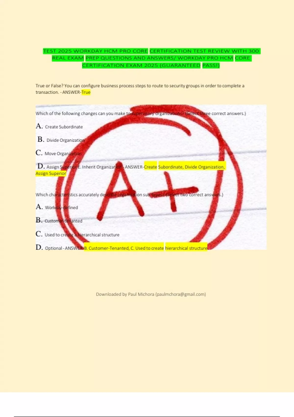 TEST 2025 WORKDAY HCM PRO CORE CERTIFICATION TEST REVIEW WITH 300 REAL EXAM PREP QUESTIONS AND ANSWERS/ WORKDAY PRO HCM CORE CERTIFICATION EXAM 2025 (GUARANTEED PASS!) True or False? You can configure business process steps to route to security groups in order to complete a transaction. - ANSWER-True Which of the following changes can you make to supervisory organizations? (Select three correct answers.) A. Create Subordinate B. Divide Organization C. Move Organization D. Assign Superior E. Inherit Organization - ANSWER-Create Subordinate, Divide Organization, Assign Superior Which characteristics accurately describe organization sub-types? (Select two correct answers.) A. Workday-defined B. Customer-tenanted C. Used to create a hierarchical structure D. Optional - ANSWER-B. Customer-Tenanted, C. Used to create hierarchical structure Downloaded by Paul Michora () A supervisory organization's primary location must have a location usage of . - ANSWER-Business Site True or False? You can only inactivate a supervisory organization if it contains no workers or unfilled positions - ANSWER-True True or False? If a worker changes positions, any roles assigned to the worker follow them to the new position. - ANSWER-False Which staffing model has the most control? Why? - ANSWER-Position Management: You must have an open, approved position in the supervisory organization to hire, promote, demote, or transfer a worker. • You define separate hiring rules and restrictions on each position. • A position remains open until you fill or manually close the position. • You can move positions from one supervisory organization to another as part of a job change. • You can report on open and filled positions, track position history, and more. Which staffing model is the most flexible? Why? - ANSWER-Job Management: You establish hiring restrictions on the supervisory organization level. The same hiring restrictions apply to all workers in the organization. • There is no system-imposed limit on the number of available jobs in the supervisory organization. Downloaded by Paul Michora () • After a worker leaves the supervisory organization, the job no longer exists. • You can only report on current headcount in the supervisory organization True or False? You can easily change a supervisory organization's staffing model after deployment. - ANSWER-False Where do you set hiring restrictions when using the job management staffing model? A. Position B. Job C. Supervisory Organization D. Job Family - ANSWER-C. Supervisory Org Where do you set hiring restrictions when using the position management staffing model? A. Position B. Job C. Supervisory Organization D. Job Family - ANSWER-Position A. Supervisory Organization Which organization type tracks financial transactions, budgets, and workers? B. Company Organization C. Cost Center Organization Downloaded by Paul Michora ()