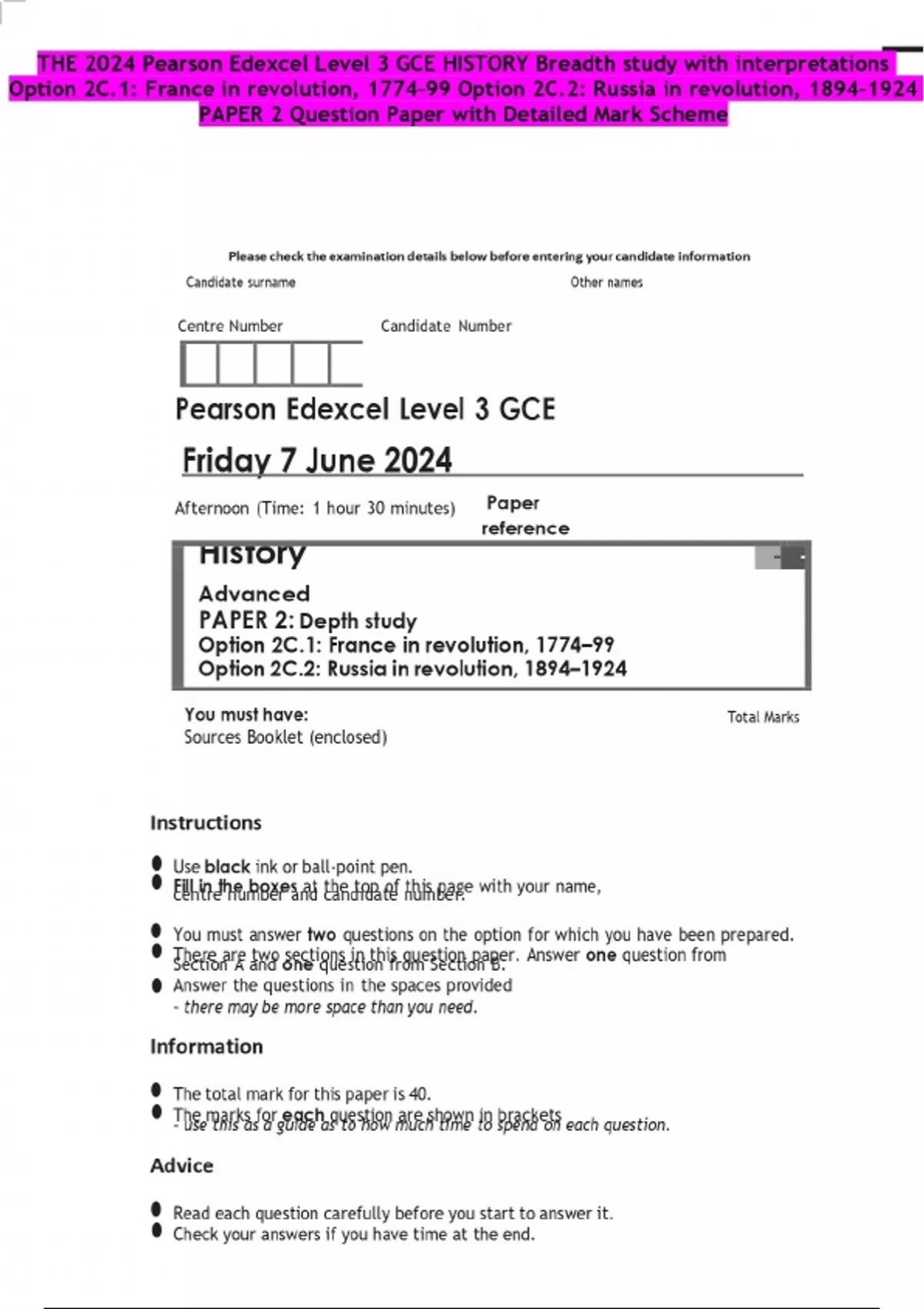 THE 2024 Pearson Edexcel Level 3 GCE HISTORY Breadth study with interpretations Option 2C.1: France in revolution, 1774–99 Option 2C.2: Russia in revolution, 1894–1924 PAPER 2 Question Paper with Detailed Mark Scheme