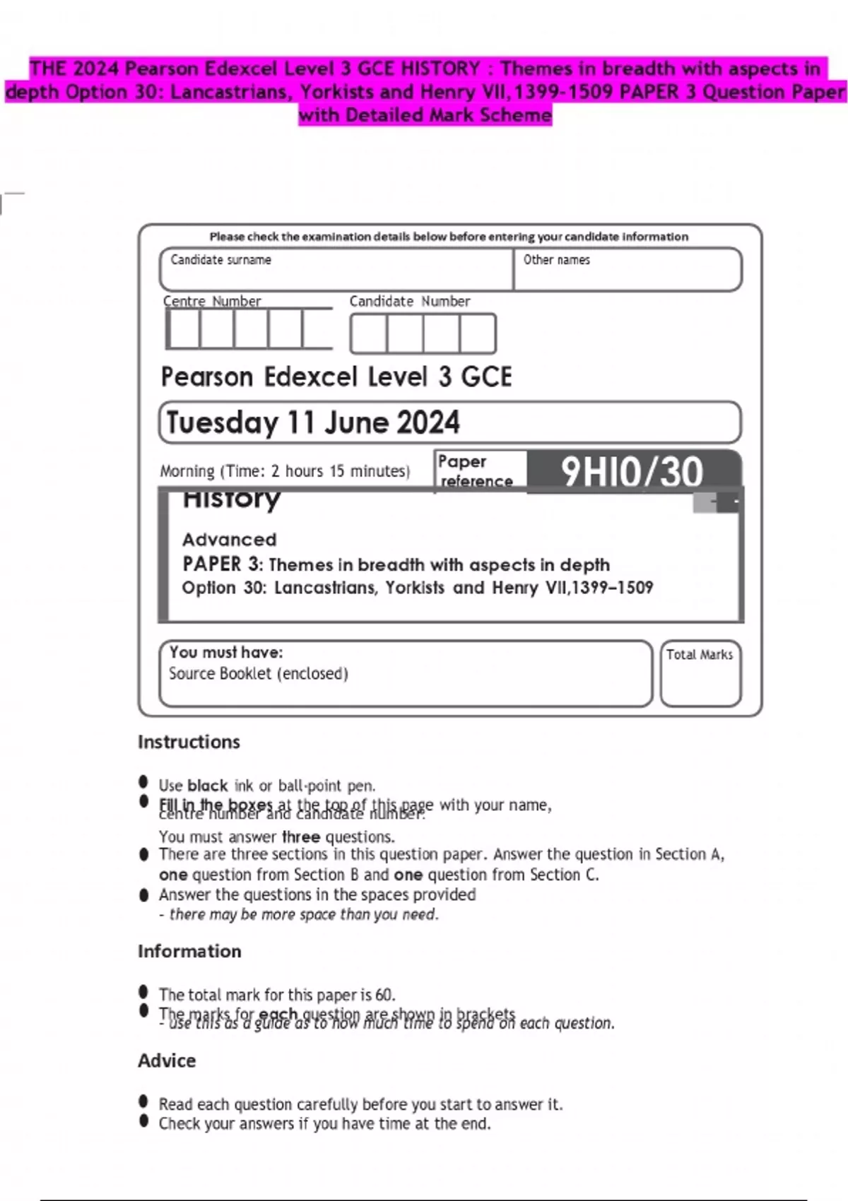 THE 2024 Pearson Edexcel Level 3 GCE HISTORY : Themes in breadth with aspects in depth Option 30: Lancastrians, Yorkists and Henry VII,1399–1509 PAPER 3 Question Paper with Detailed Mark Scheme