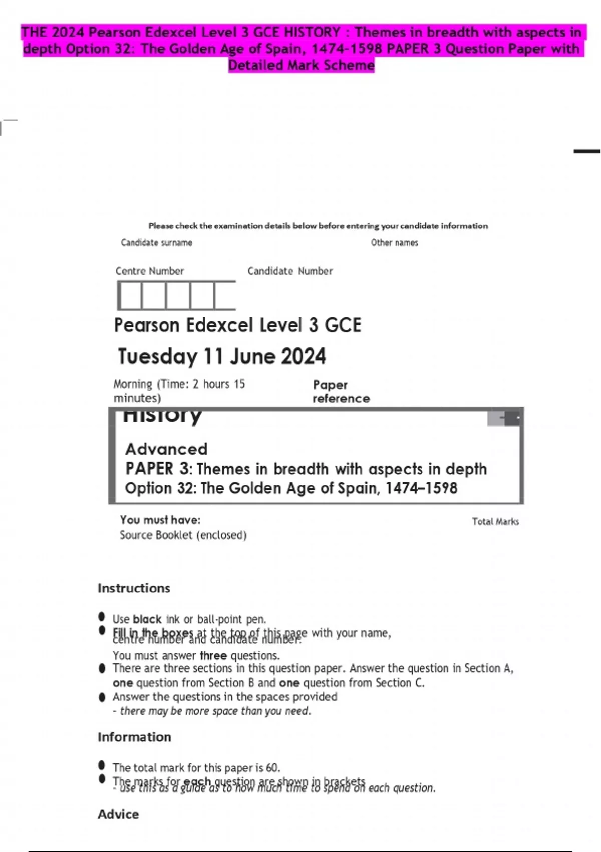 THE 2024 Pearson Edexcel Level 3 GCE HISTORY : Themes in breadth with aspects in depth Option 32: The Golden Age of Spain, 1474–1598 PAPER 3 Question Paper with Detailed Mark Scheme