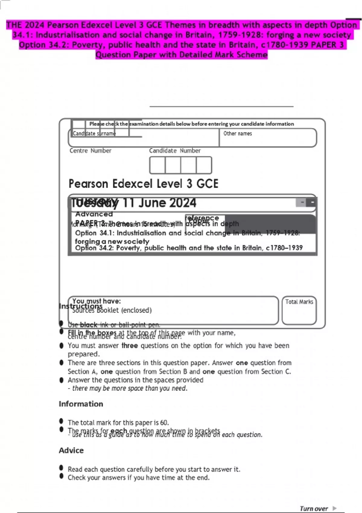 THE 2024 Pearson Edexcel Level 3 GCE Themes in breadth with aspects in depth Option 34.1: Industrialisation and social change in Britain, 1759–1928: forging a new society Option 34.2: Poverty, public health and the state in Britain, c1780–1939 PAPER 3 Question Paper with Detailed Mark Scheme
