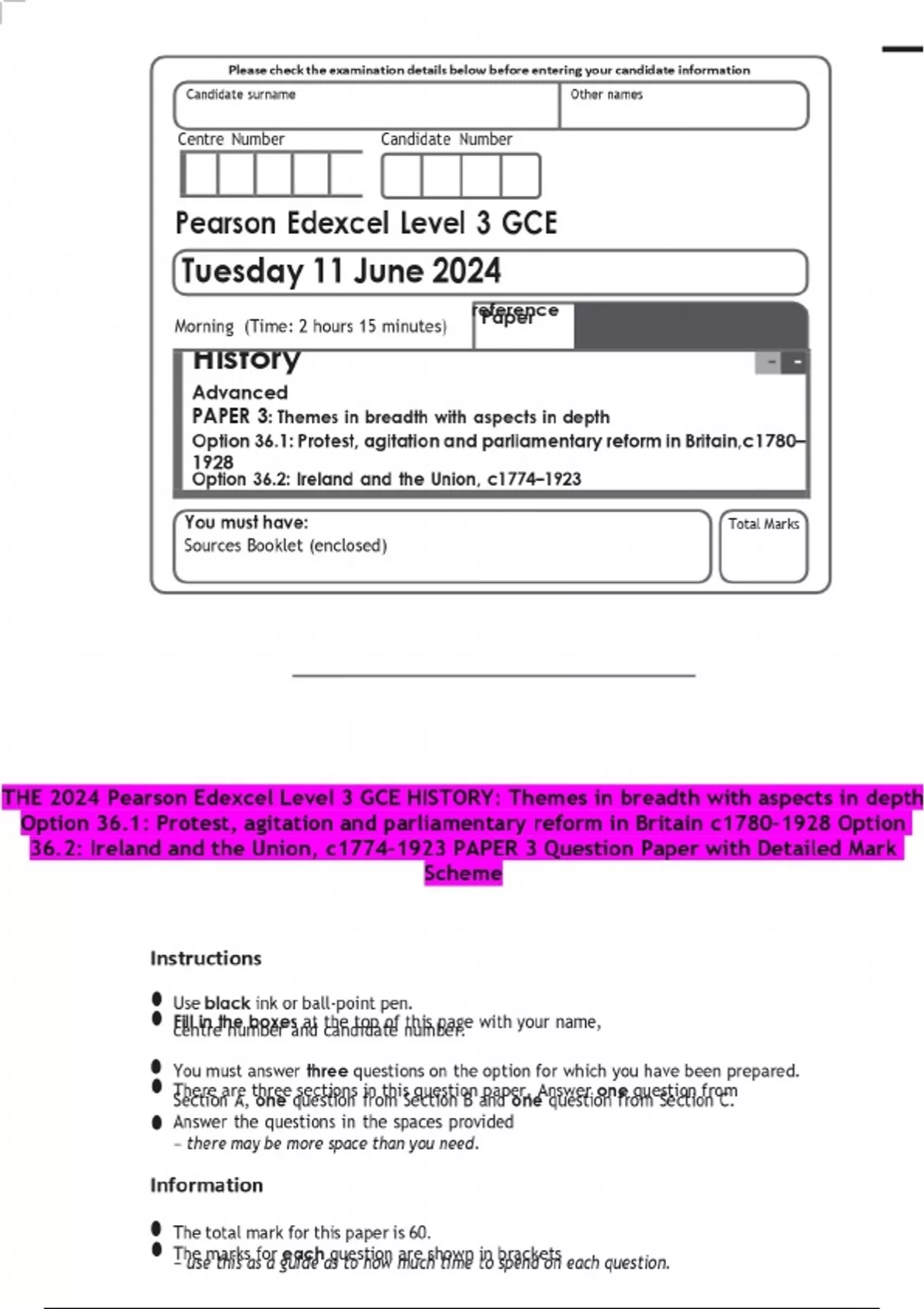 THE 2024 Pearson Edexcel Level 3 GCE HISTORY: Themes in breadth with aspects in depth Option 36.1: Protest, agitation and parliamentary reform in Britain c1780–1928 Option 36.2: Ireland and the Union, c1774–1923 PAPER 3 Question Paper with Detailed Mark S