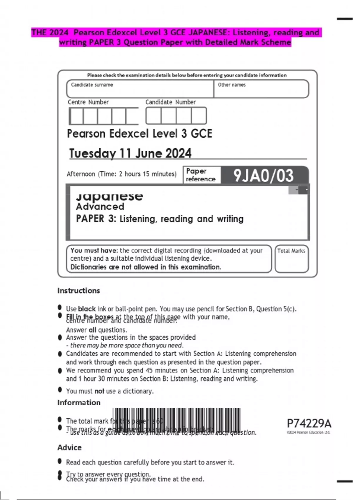 THE 2024 Pearson Edexcel Level 3 GCE JAPANESE: Listening, reading and writing PAPER 3 Question Paper with Detailed Mark Scheme