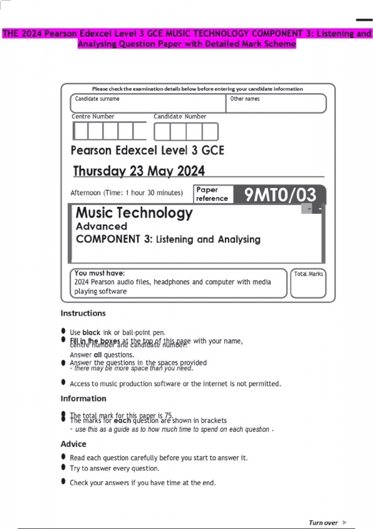 THE 2024 Pearson Edexcel Level 3 GCE MUSIC TECHNOLOGY COMPONENT 3: Listening and Analysing Question Paper with Detailed Mark Scheme