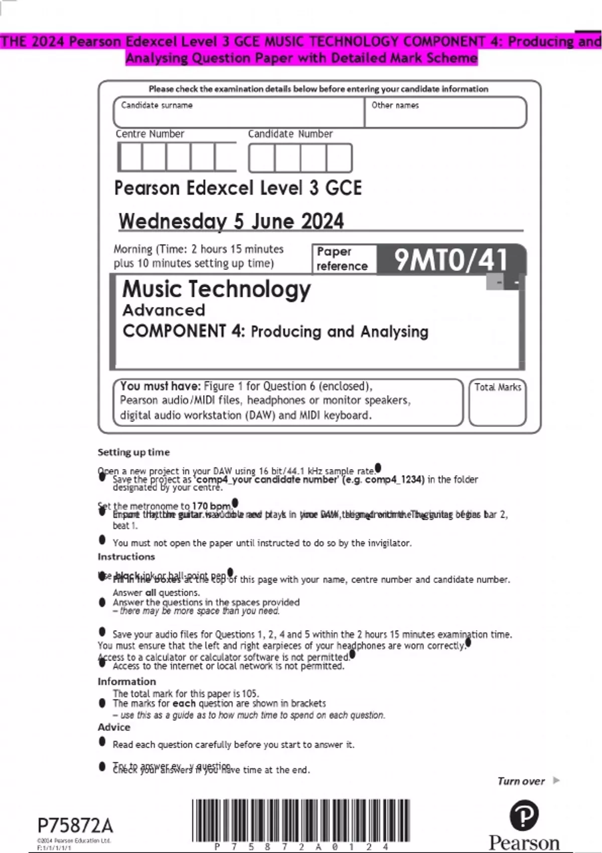 THE 2024 Pearson Edexcel Level 3 GCE MUSIC TECHNOLOGY COMPONENT 4: Producing and Analysing Question Paper with Detailed Mark Scheme