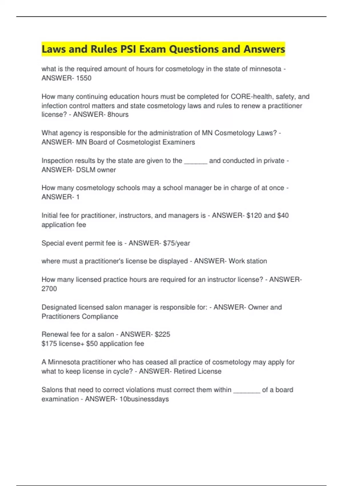 Laws and Rules PSI Exam Questions and Answers what is the required amount of hours for cosmetology in the state of minnesota - ANSWER- 1550 How many continuing education hours must be completed for CORE-health, safety, and infection control matters and state cosmetology laws and rules to renew a practitioner license? - ANSWER- 8hours What agency is responsible for the administration of MN Cosmetology Laws? - ANSWER- MN Board of Cosmetologist Examiners Inspection results by the state are given to the ______ and conducted in private - ANSWER- DSLM owner How many cosmetology schools may a school manager be in charge of at once - ANSWER- 1 Initial fee for practitioner, instructors, and managers is - ANSWER- $120 and $40 application fee