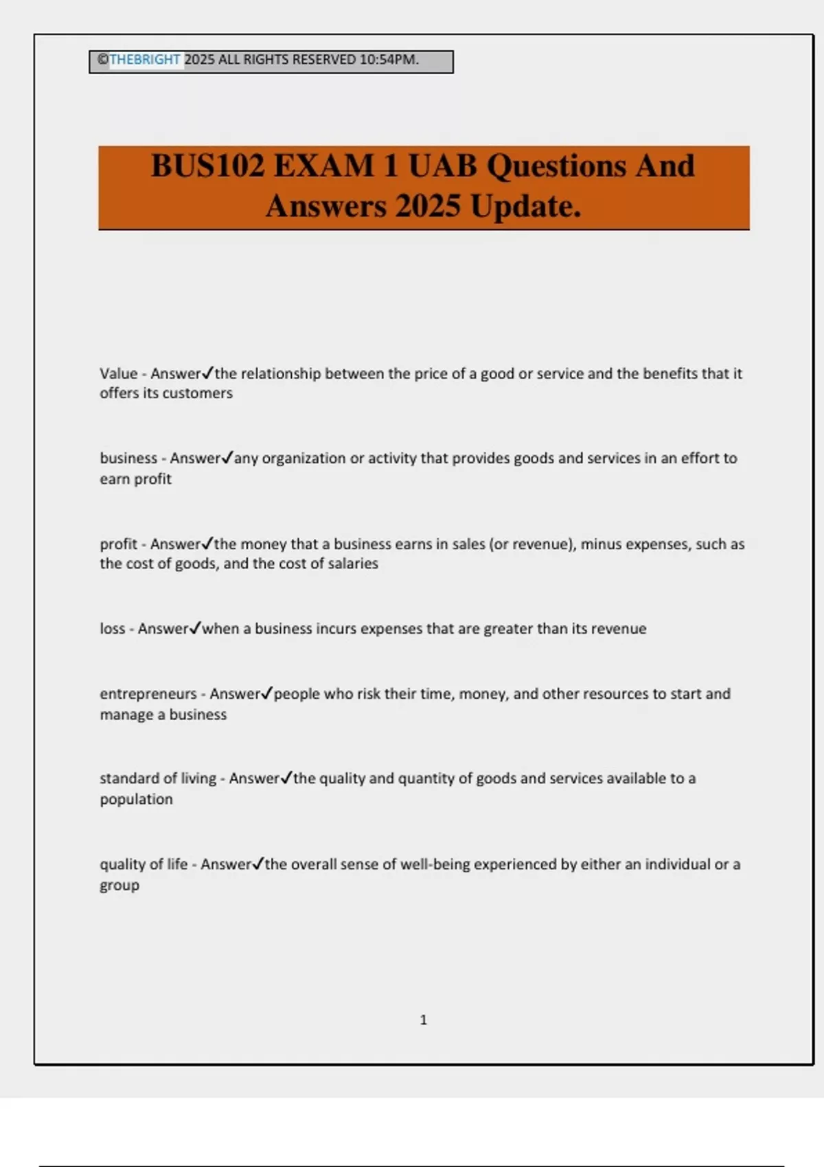©THEBRIGHT 2025 ALL RIGHTS RESERVED 10:54PM. 1 BUS102 EXAM 1 UAB Questions And Answers 2025 Update. Value - Answerthe relationship between the price of a good or service and the benefits that it offers its customers business - Answerany organization or activity that provides goods and services in an effort to earn profit profit - Answerthe money that a business earns in sales (or revenue), minus expenses, such as the cost of goods, and the cost of salaries loss - Answerwhen a business incurs expenses that are greater than its revenue entrepreneurs - Answerpeople who risk their time, money, and other resources to start and manage a business standard of living - Answerthe quality and quantity of goods and services available to a population quality of life - Answerthe overall sense of well-being experienced by either an individual or a group ©THEBRIGHT 2025 ALL RIGHTS RESERVED 10:54PM. 2 non-profits - Answerbusiness-like establishments that employ people and produce goods and services with the fundamental goal of contributing to the community rather than generating financial gain factors of production - Answerfour fundamental elements-natural resources, capital, human resources, and entrepreneurship-that businesses need to achieve their objectives business environment - Answerthe setting in which a business operates. the five key components are economic environment, competitive environment, technological environment, social environment, and global environment. business technology - Answerany tools- especially computers, telecommunications, and other digital products- that businesses can use to become more efficient and effective e-commerce - Answerbusiness transactions conducted online, typically via the internet demographics - Answerthe measurable characteristics of a population. demographic factors include population size and density, as well as specific traits such as age, gender, and race what is the role of business in the economy? - Answerbusinesses allow the economy to run by providing jobs as well as goods and services. successful businesses lean forward and embrace the change rather than failing. they seek opportunities and avoid the pitfalls. they carefully evaluate risks. they completely understand their market and make ethical decisions how has business evolved? - Answerindustrial revolution > Entrepreneurship era > production era > marketing era > relationship era what is the role of non-profits in the economy? - Answerimprove quality of life, economic stability and growth, and they create economic magnets what are the core factors of production? - Answernatural resources, capital, human resources, and entrepreneurs