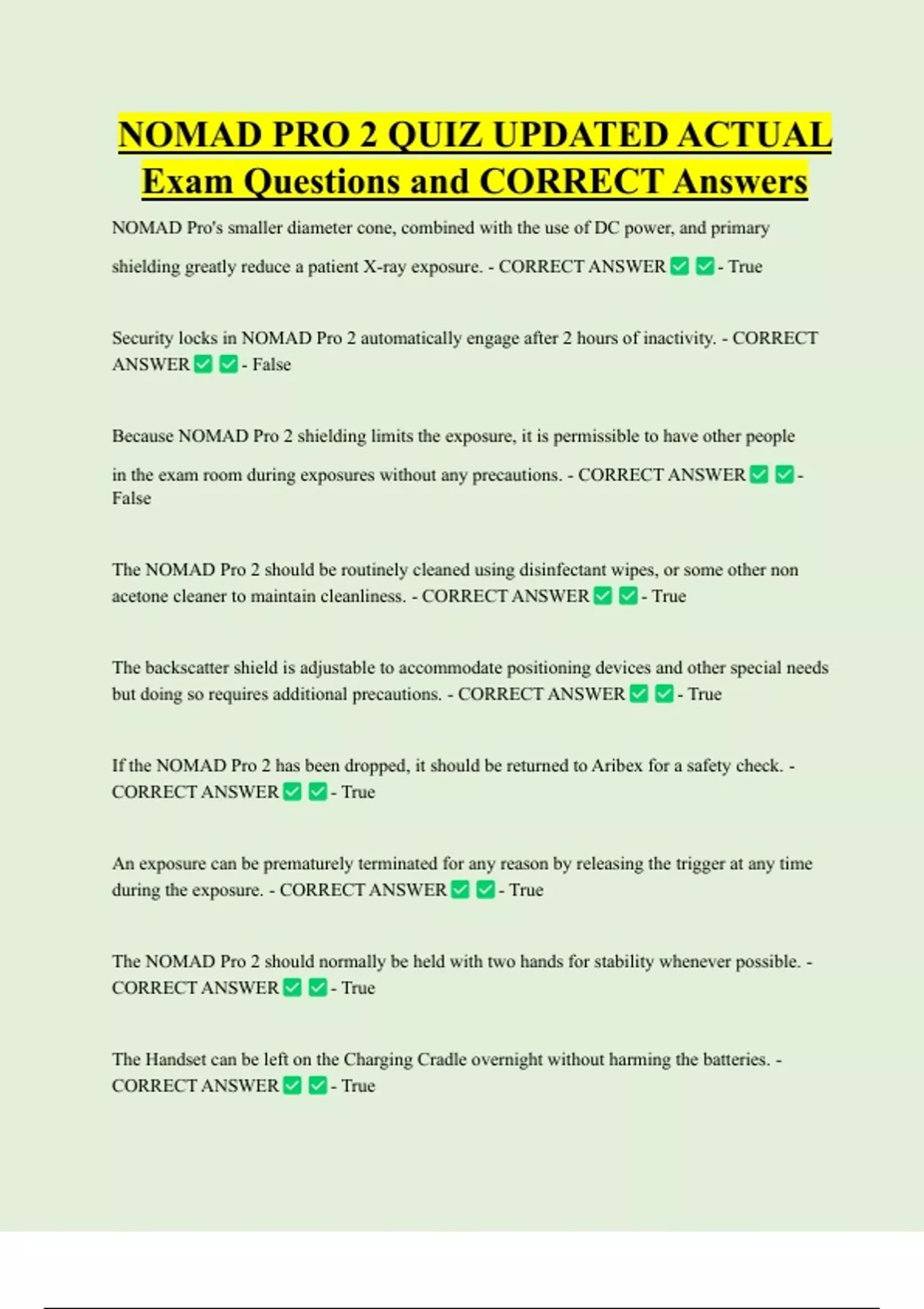 NOMAD PRO 2 QUIZ UPDATED ACTUAL Exam Questions and CORRECT Answers NOMAD Pro's smaller diameter cone, combined with the use of DC power, and primary shielding greatly reduce a patient X-ray exposure. - CORRECT ANSWER - False - True Security locks in NOMAD Pro 2 automatically engage after 2 hours of inactivity. - CORRECT ANSWER Because NOMAD Pro 2 shielding limits the exposure, it is permissible to have other people in the exam room during exposures without any precautions. - CORRECT ANSWER