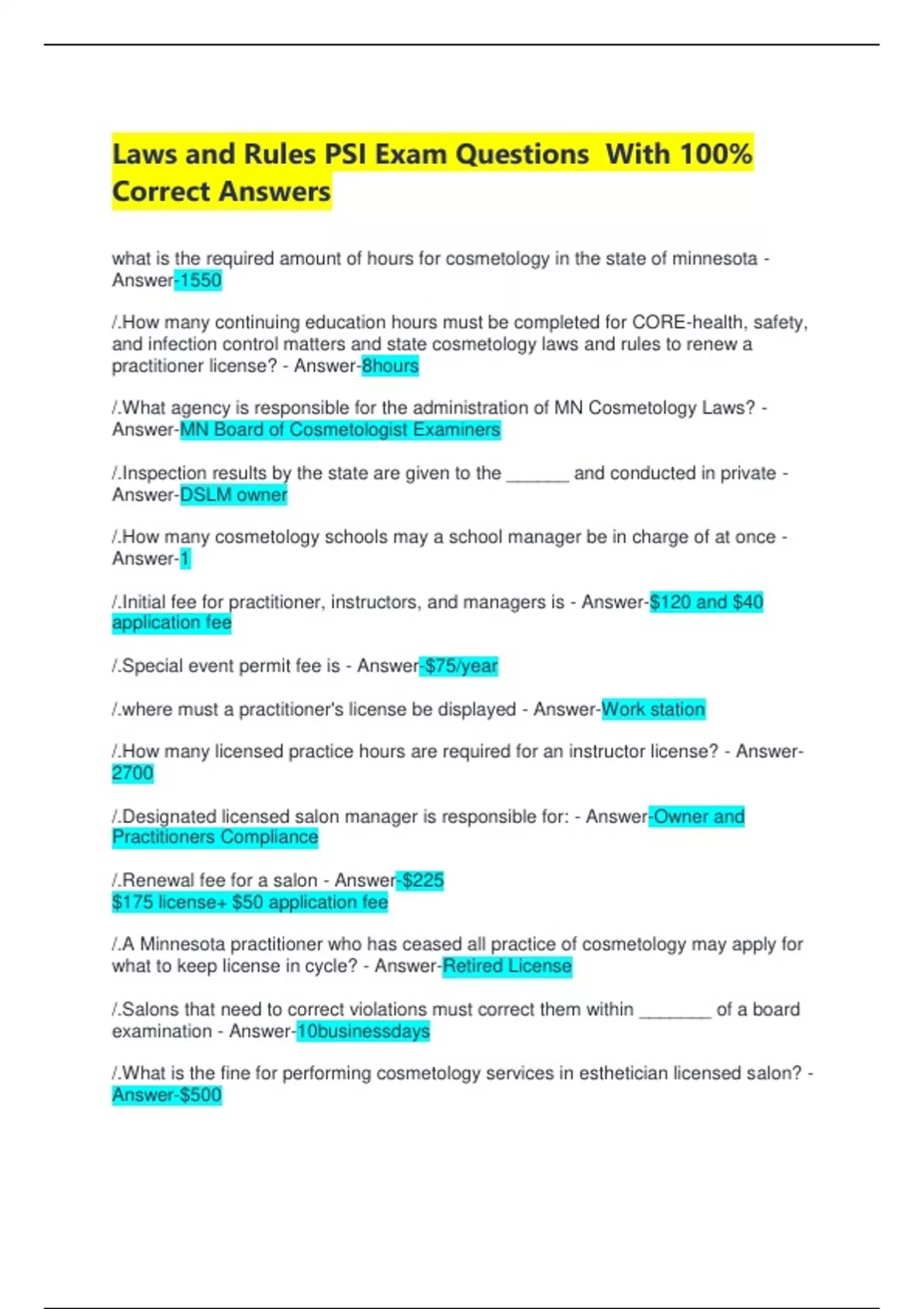 Laws and Rules PSI Exam Questions With 100% Correct Answers what is the required amount of hours for cosmetology in the state of minnesota - Answer-1550 /.How many continuing education hours must be completed for CORE-health, safety, and infection control matters and state cosmetology laws and rules to renew a practitioner license? - Answer-8hours /.What agency is responsible for the administration of MN Cosmetology Laws? - Answer-MN Board of Cosmetologist Examiners /.Inspection results by the state are given to the ______ and conducted in private - Answer-DSLM owner /.How many cosmetology schools may a school manager be in charge of at once - Answer-1 /.Initial fee for practitioner, instructors, and managers is - Answer-$120 and $40 application fee /.Special event permit fee is - Answer-$75/year /.where must a practitioner's license be displayed - Answer-Work station /.How many licensed practice hours are required for an instructor license? - Answer-2700 /.Designated licensed salon manager is responsible for: - Answer-Owner and Practitioners Compliance /.Renewal fee for a salon - Answer-$225 $175 license+ $50 application fee /.A Minnesota practitioner who has ceased all practice of cosmetology may apply for what to keep license in cycle? - Answer-Retired License /.Salons that need to correct violations must correct them within _______ of a board examination - Answer-10businessdays /.What is the fine for performing cosmetology services in esthetician licensed salon? - Answer-$500 /.Registration fee for hair braiders - Answer-$20 /.Single use equipment & materials may be used for how many applications - Answer-One /.T/F: An Eyelash Extension Technician is someone that is not a Cosmetologist, Esthetician, or Advance Practice Esthetician - Answer-True /.Name change fee - Answer-$20 /.When does a retired license expire - Answer-3 year license cycle /.How many hand washing sinks must a work area have? - Answer-At least one per area /.What must each salon maintain and have readily accessible - Answer-First Aid Kit /.The definition of "school" is, a place where any person operates and maintains a - Answer-Class to teach for compensation /.What is the late fee for renewal of a practitioner license? - Answer-$45 /.A ______ is any person who, for compensation, performs personal services for the cosmetic care of the hands, feet, and nails only - Answer-nail tech /.Pedicure stations, including basins piped tubs must - Answer-be cleaned+disinfected /.What month does a practitioner's license expire? - Answer-Last day of the Individual's birth month every 3 years /.What is the definition of clean? - Answer-Free from all soil, debris, washed with soap and rinsed /.Disinfectant solutions and containers must be - Answer-Closed /.If a licensee has a name change or address change they must notify the board within - Answer-30 days /.An esthetician is any person who - Answer-Practices cosmetic treatments to stratum corneum /.What is the required number of hours for a manger's license? - Answer-2700 /.A mobile salon is a salon that is operated in - Answer-mobile vehicle/structure