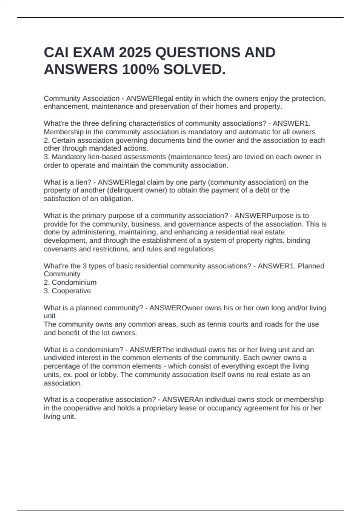 Community Association - ANSWERlegal entity in which the owners enjoy the protection, enhancement, maintenance and preservation of their homes and property. What're the three defining characteristics of community associations? - ANSWER1. Membership in the community association is mandatory and automatic for all owners 2. Certain association governing documents bind the owner and the association to each other through mandated actions. 3. Mandatory lien-based assessments (maintenance fees) are levied on each owner in order to operate and maintain the community association. What is a lien? - ANSWERlegal claim by one party (community association) on the property of another (delinquent owner) to obtain the payment of a debt or the satisfaction of an obligation. What is the primary purpose of a community association? - ANSWERPurpose is to provide for the community, business, and governance aspects of the association. This is done by administering, maintaining, and enhancing a residential real estate development, and through the establishment of a system of property rights, binding covenants and restrictions, and rules and regulations. What're the 3 types of basic residential community associations? - ANSWER1. Planned Community 2. Condominium 3. Cooperative