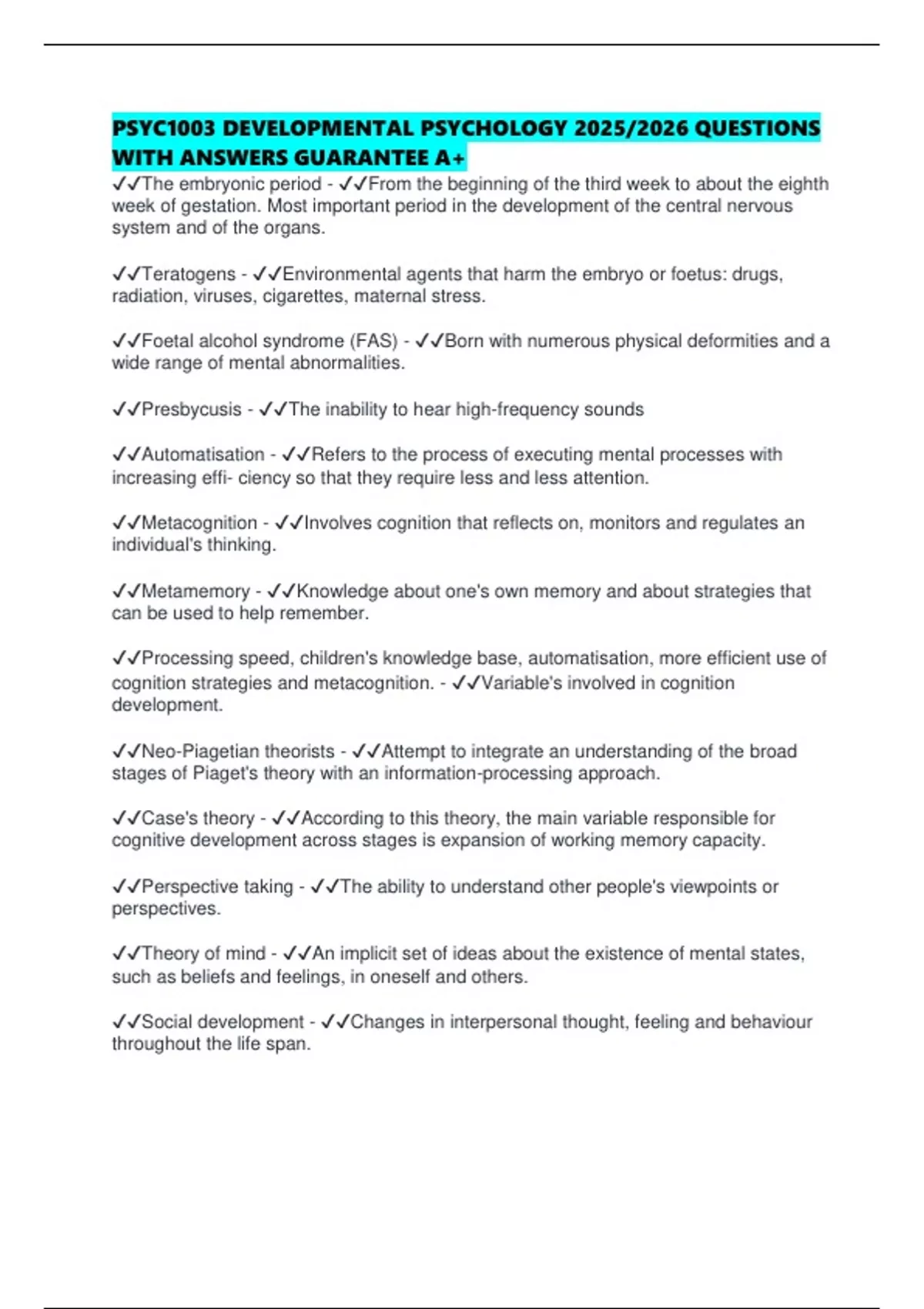 PSYC1003 DEVELOPMENTAL PSYCHOLOGY 2025/2026 QUESTIONS WITH ANSWERS GUARANTEE A+