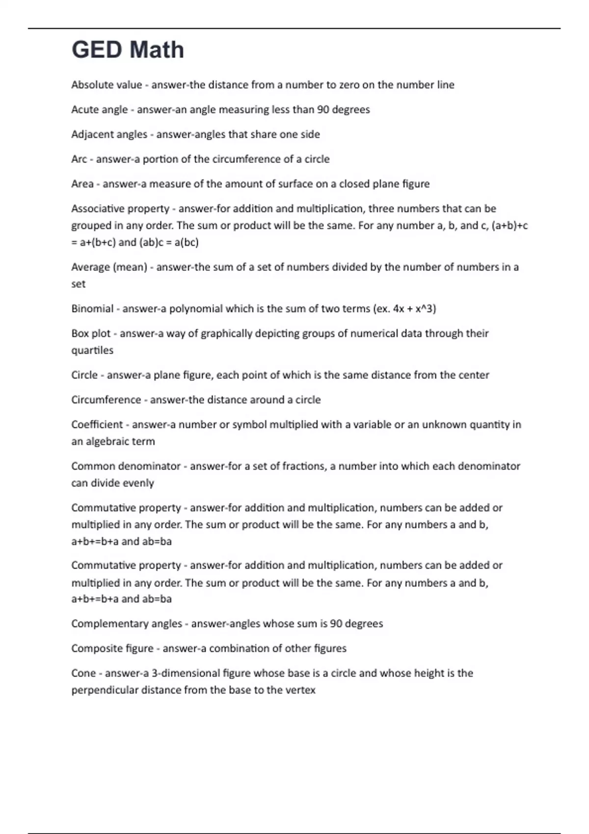 Absolute value - answer-the distance from a number to zero on the number line Acute angle - answer-an angle measuring less than 90 degrees Adjacent angles - answer-angles that share one side Arc - answer-a portion of the circumference of a circle Area - answer-a measure of the amount of surface on a closed plane figure Associative property - answer-for addition and multiplication, three numbers that can be grouped in any order. The sum or product will be the same. For any number a, b, and c, (a+b)+c = a+(b+c) and (ab)c = a(bc) Average (mean) - answer-the sum of a set of numbers divided by the number of numbers in a set Binomial - answer-a polynomial which is the sum of two terms (ex. 4x + x^3) Box plot - answer-a way of graphically depicting groups of numerical data through their quartiles
