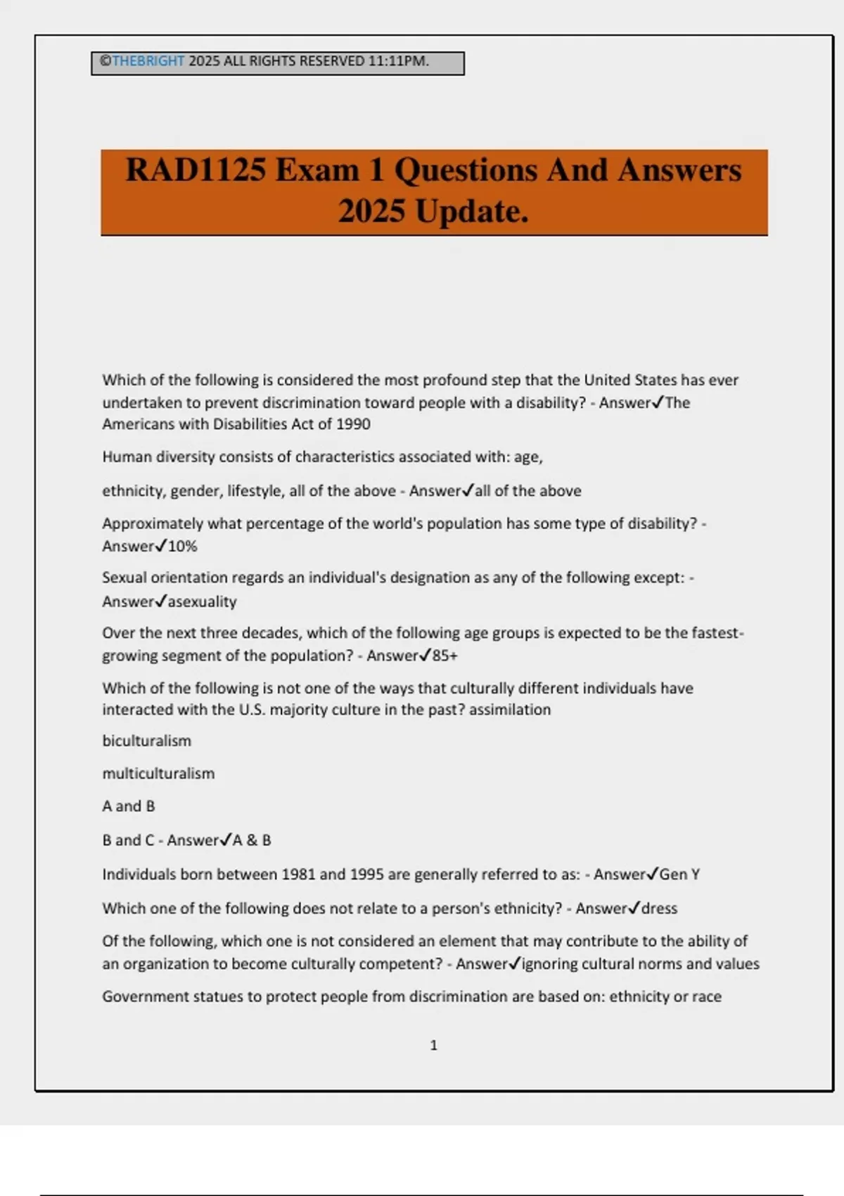 ©THEBRIGHT 2025 ALL RIGHTS RESERVED 11:11PM. 1 RAD1125 Exam 1 Questions And Answers 2025 Update. Which of the following is considered the most profound step that the United States has ever undertaken to prevent discrimination toward people with a disability? - AnswerThe Americans with Disabilities Act of 1990 Human diversity consists of characteristics associated with: age, ethnicity, gender, lifestyle, all of the above - Answerall of the above Approximately what percentage of the world's population has some type of disability? - Answer10% Sexual orientation regards an individual's designation as any of the following except: - Answerasexuality Over the next three decades, which of the following age groups is expected to be the fastest- growing segment of the population? - Answer85+ Which of the following is not one of the ways that culturally different individuals have interacted with the U.S. majority culture in the past? assimilation biculturalism multiculturalism A and B B and C - AnswerA & B Individuals born between 1981 and 1995 are generally referred to as: - AnswerGen Y Which one of the following does not relate to a person's ethnicity? - Answerdress Of the following, which one is not considered an element that may contribute to the ability of an organization to become culturally competent? - Answerignoring cultural norms and values Government statues to protect people fr