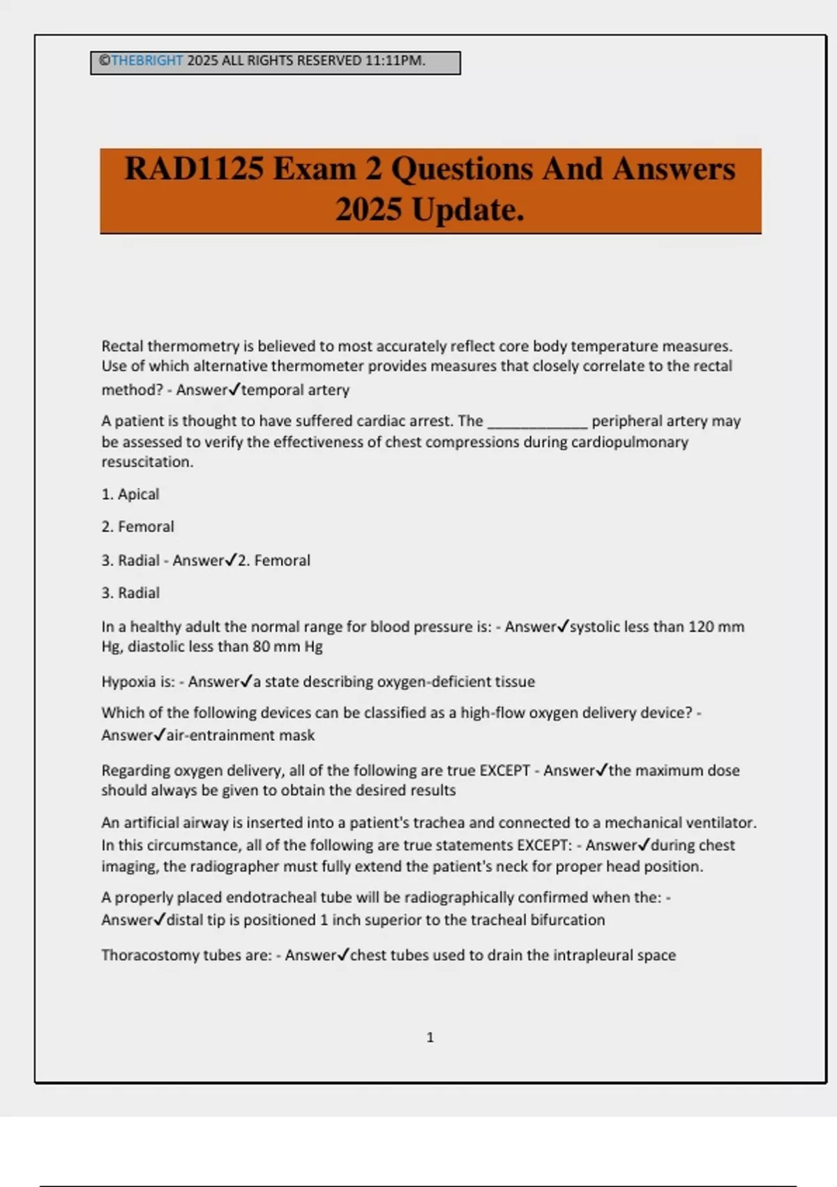 ©THEBRIGHT 2025 ALL RIGHTS RESERVED 11:11PM. 1 RAD1125 Exam 2 Questions And Answers 2025 Update. Rectal thermometry is believed to most accurately reflect core body temperature measures. Use of which alternative thermometer provides measures that closely correlate to the rectal method? - Answertemporal artery A patient is thought to have suffered cardiac arrest. The ____________ peripheral artery may be assessed to verify the effectiveness of chest compressions during cardiopulmonary resuscitation. 1. Apical 2. Femoral 3. Radial - Answer2. Femoral 3. Radial In a healthy adult the normal range for blood pressure is: - Answersystolic less than 120 mm Hg, diastolic less than 80 mm Hg Hypoxia is: - Answera state describing oxygen-deficient tissue Which of the following devices can be classified as a high-flow oxygen delivery device? - Answerair-entrainment mask Regarding oxygen delivery, all of the following are true EXCEPT - Answerthe maximum dose should always be given to obtain the desired results An artificial airway is inserted into a patient's trachea and connected to a mechanical ventilator. In this circumstance, all of the following are true statements EXCEPT: - Answerduring chest imaging, the radiographer must fully extend the patient's neck for proper head position. A properly placed endotracheal tube will be radiographically confirmed when the: - Answerdistal tip is positioned 1 inch superior to the tracheal bifurcation Thoracostomy tubes are: - Answerchest t