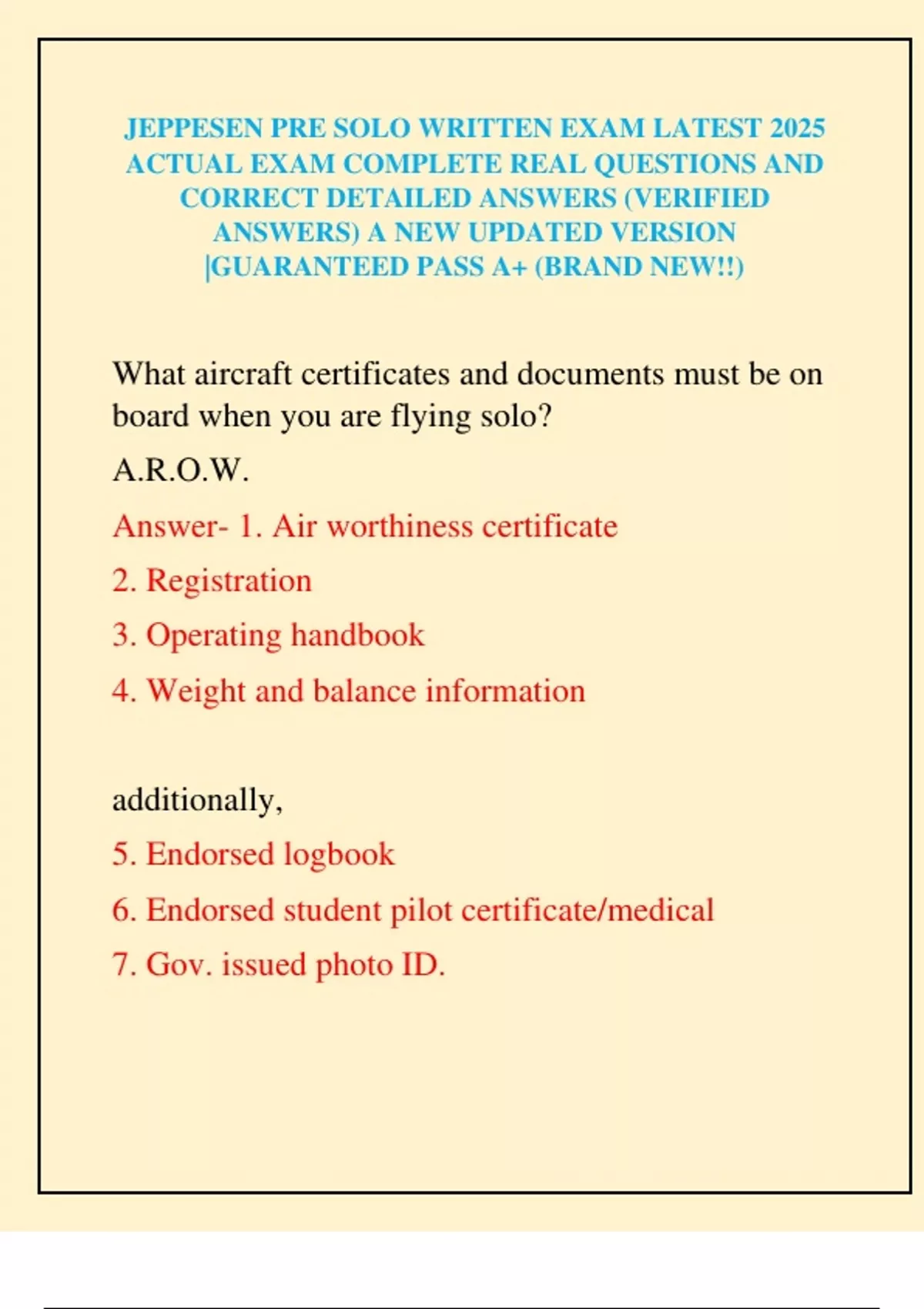 JEPPESEN PRE SOLO WRITTEN EXAM LATEST 2025 ACTUAL EXAM COMPLETE REAL QUESTIONS AND CORRECT DETAILED ANSWERS (VERIFIED ANSWERS) A NEW UPDATED VERSION |GUARANTEED PASS A+ (BRAND NEW!!)