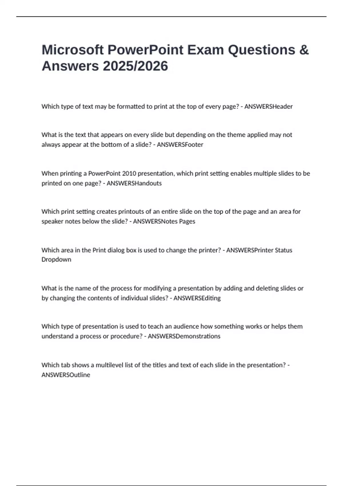Microsoft PowerPoint Exam Questions & Answers 2025/2026 Which type of text may be formatted to print at the top of every page? - ANSWERSHeader What is the text that appears on every slide but depending on the theme applied may not always appear at the bottom of a slide? - ANSWERSFooter When printing a PowerPoint 2010 presentation, which print setting enables multiple slides to be printed on one page? - ANSWERSHandouts Which print setting creates printouts of an entire slide on the top of the page and an area for speaker notes below the slide? - ANSWERSNotes Pages Which area in the Print dialog box is used to change the printer? - ANSWERSPrinter Status Dropdown What is the name of the process for modifying a presentation by adding and deleting slides or by changing the contents of individual slides? - ANSWERSEditing Which type of presentation is used to teach an audience how something works or helps them understand a process or procedure? - ANSWERSDemonstrations Which tab shows a multilevel list of the titles and text of each slide in the presentation? - ANSWERSOutline