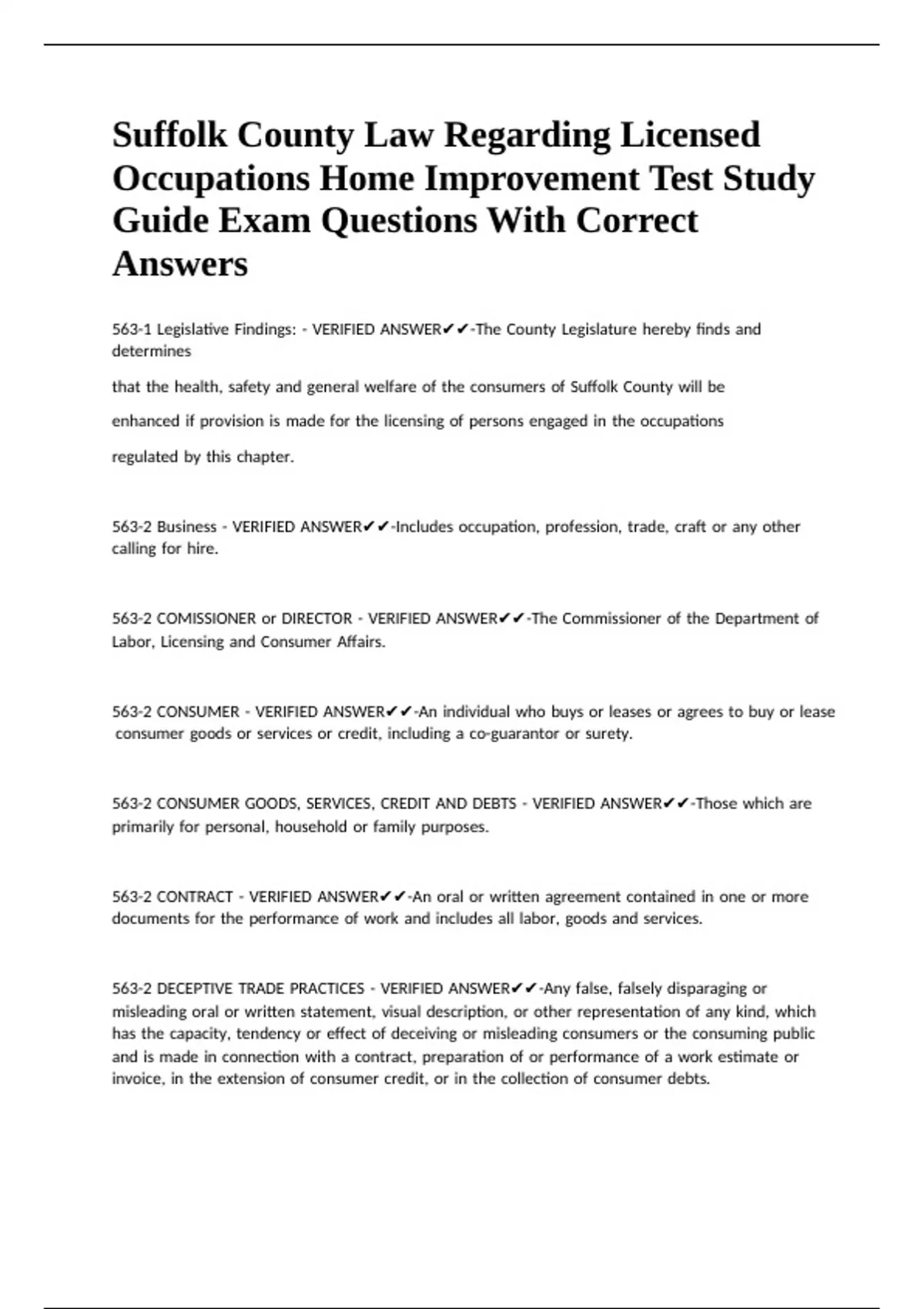 Suffolk County Law Regarding Licensed Occupations Home Improvement Test Study Guide Exam Questions With Correct Answers