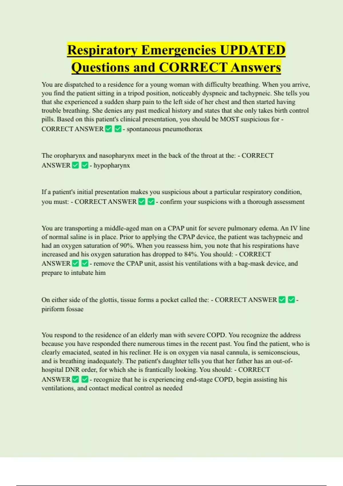 Respiratory Emergencies UPDATED Questions and CORRECT Answers