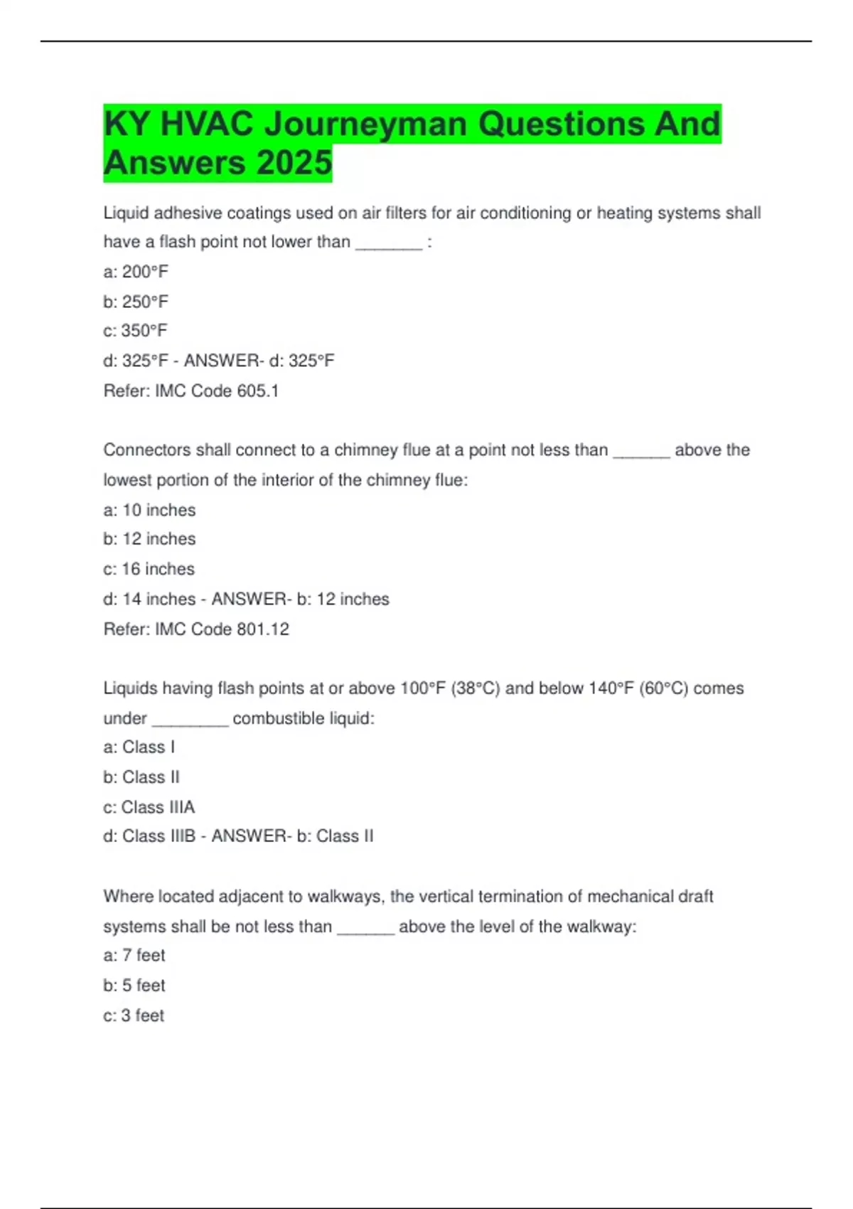KY HVAC Journeyman Questions And Answers 2025 Liquid adhesive coatings used on air filters for air conditioning or heating systems shall have a flash point not lower than _______ : a: 200°F b: 250°F c: 350°F d: 325°F - ANSWER- d: 325°F Refer: IMC Code 605.1 Connectors shall connect to a chimney flue at a point not less than ______ above the lowest portion of the interior of the chimney flue: a: 10 inches b: 12 inches c: 16 inches d: 14 inches - ANSWER- b: 12 inches Refer: IMC Code 801.12
