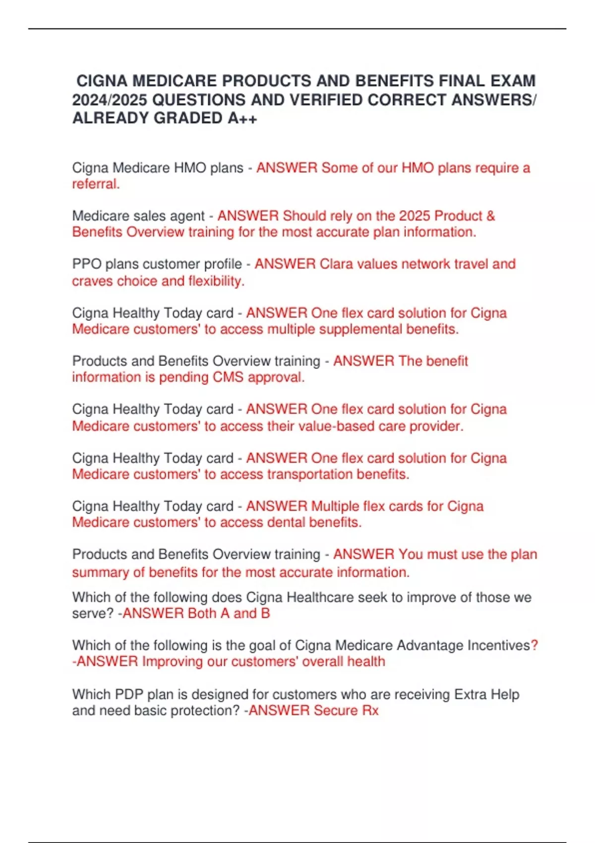 CIGNA MEDICARE PRODUCTS AND BENEFITS FINAL EXAM 2024/2025 QUESTIONS AND VERIFIED CORRECT ANSWERS/ ALREADY GRADED A++ CIGNA MEDICARE PRODUCTS AND BENEFITS FINAL EXAM 2024/2025 QUESTIONS AND VERIFIED CORRECT ANSWERS/ ALREADY GRADED A++