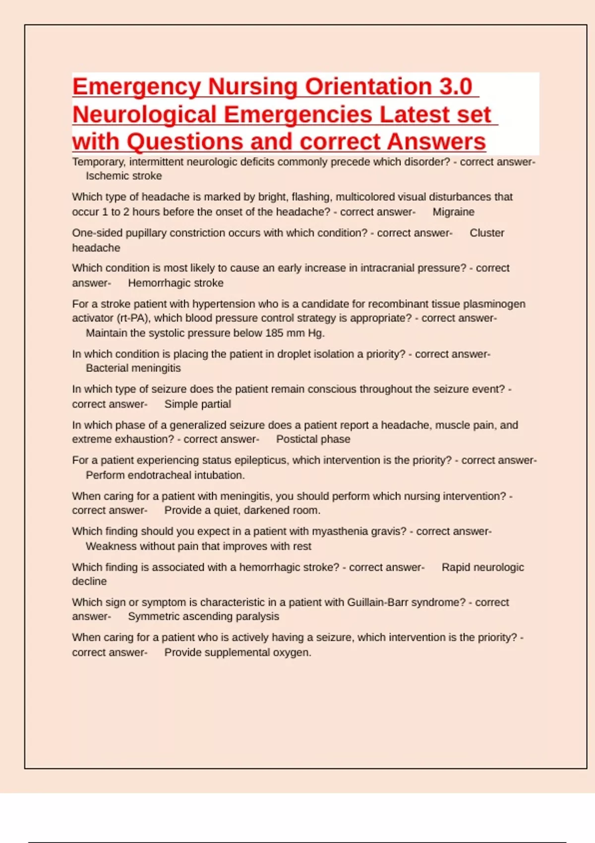 Emergency Nursing Orientation 3.0 Neurological Emergencies Latest set with Questions and correct Answers