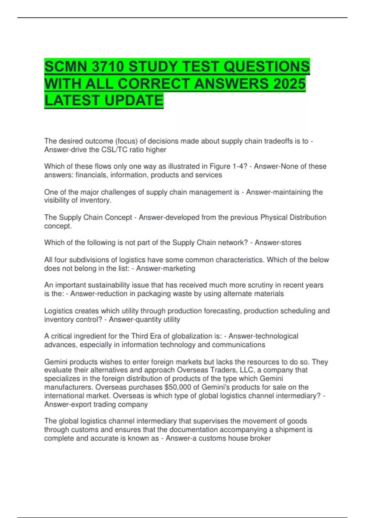 SCMN 3710 STUDY TEST QUESTIONS WITH ALL CORRECT ANSWERS 2025 LATEST UPDATE The desired outcome (focus) of decisions made about supply chain tradeoffs is to - Answer-drive the CSL/TC ratio higher Which of these flows only one way as illustrated in Figure 1-4? - Answer-None of these answers: financials, information, products and services One of the major challenges of supply chain management is - Answer-maintaining the visibility of inventory. The Supply Chain Concept - Answer-developed from the previous Physical Distribution concept. Which of the following is not part of the Supply Chain network? - Answer-stores All four subdivisions of logistics have some common characteristics. Which of the below does not belong in the list: - Answer-marketing An important sustainability issue that has received much more scrutiny in recent years is the: - Answer-reduction in packaging waste by using alternate materials Logistics creates which utility through production forecasting, production scheduling and inventory control? - Answer-quantity utility A critical ingredient for the Third Era of globalization is: - Answer-technological advances, especially in information technology and communications Gemini products wishes to enter foreign markets but lacks the resources to do so. They evaluate their alternatives and approach Overseas Traders, LLC, a company that specializes in the foreign distribution of products of the type which Gemini manufacturers. Overseas purchases $50,000 of Gemini's products for sale on the international market. Overseas is which type of global logistics channel intermediary? - Answer-export trading company The global logistics channel intermediary that supervises the movement of goods through customs and ensures that the documentation accompanying a shipment is complete and accurate is known as - Answer-a customs house broker Which type of global logistics channel intermediary enables goods to move through customs more easily by consolidating small shipments into more economical sizes? - Answer-foreign freight forwarder The least-frequently used IT-based services by customers of 3PLs are: - Answer-strategic and customer-related