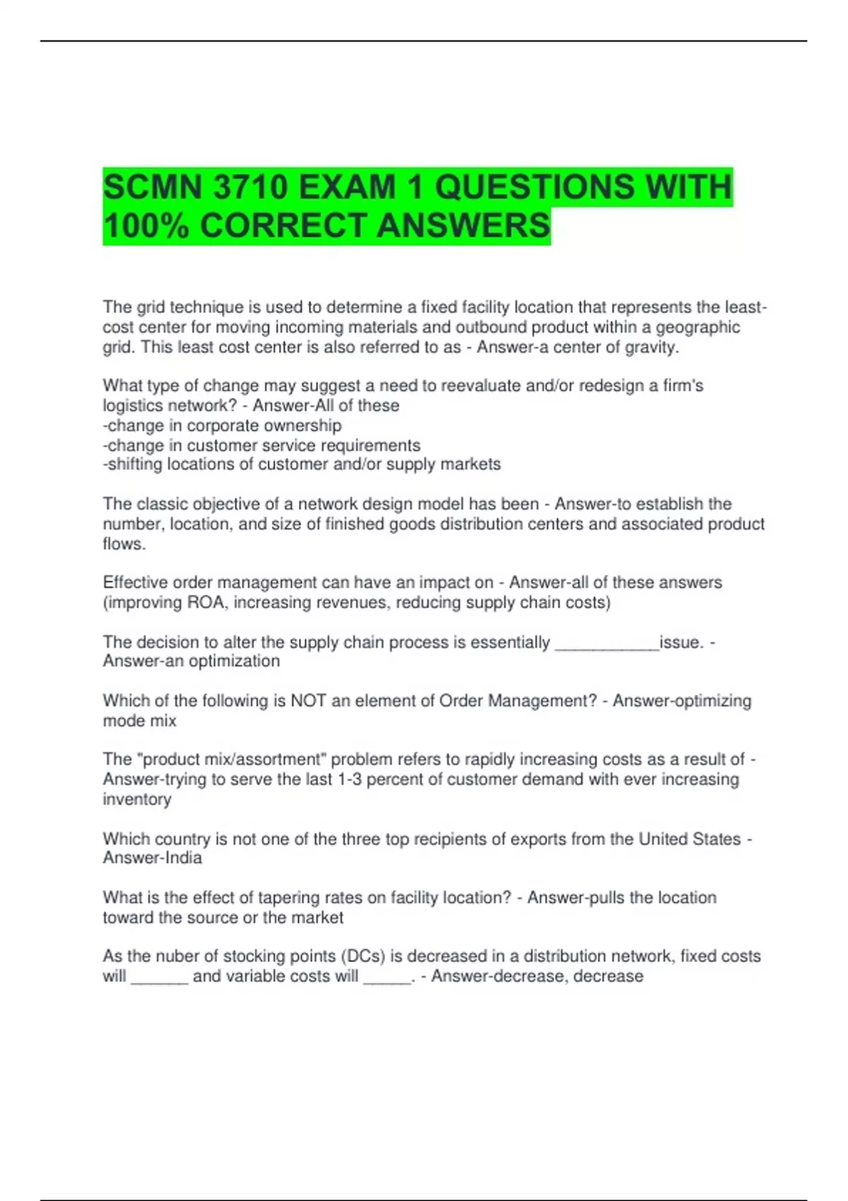 SCMN 3710 EXAM 1 QUESTIONS WITH 100% CORRECT ANSWERS The grid technique is used to determine a fixed facility location that represents the least-cost center for moving incoming materials and outbound product within a geographic grid. This least cost center is also referred to as - Answer-a center of gravity. What type of change may suggest a need to reevaluate and/or redesign a firm's logistics network? - Answer-All of these -change in corporate ownership -change in customer service requirements -shifting locations of customer and/or supply markets The classic objective of a network design model has been - Answer-to establish the number, location, and size of finished goods distribution centers and associated product flows. Effective order management can have an impact on - Answer-all of these answers (improving ROA, increasing revenues, reducing supply chain costs) The decision to alter the supply chain process is essentially ___________issue. - Answer-an optimization Which of the following is NOT an element of Order Management? - Answer-optimizing mode mix The "product mix/assortment" problem refers to rapidly increasing costs as a result of - Answer-trying to serve the last 1-3 percent of customer demand with ever increasing inventory Which country is not one of the three top recipients of exports from the United States - Answer-India What is the effect of tapering rates on facility location? - Answer-pulls the location toward the source or the market As the nuber of stocking points (DCs) is decreased in a distribution network, fixed costs will ______ and variable costs will _____. - Answer-decrease, decrease The time that elapses from when a company receives an order until it gets paid for delivering the order is called the: - Answer-Order to cash cycle Traditionally, information has been viewed as flowing in the opposite direction of products, that is, from the market/customer back to the wholesalers, manufacturers, and vendors. - Answer-None of these answers ( This is still true and has not changed, Computerization has greatly increased the flow of information from the source, The "Big Box" stores have developed their own sources) The Supply Chain Concept - Answer-developed from the previous Physical Distribution concept Which of these flows only one way as illustrated in Figure 1-4? - Answer-None of these answers (financials, products and services, information) A(n) _______ relationship exists between the cost of lost sales and inventory cost - Answer-inverse These are designated by the U.S. secretary of the treasury for the purpose of storing, repacking, sorting or cleaning imported merchandise entered for warehousing without paying import duties while the goods are in storage - Answer-Bonded warehouses SQ: In the short run, the firm's network is _________ while in the long run it is ________. - Answer-fixed, variable While available evidence supports the fact that the president or CEO and the finance executive are often involved with the identification of the need for logistic services, - Answer-executives from other areas in the company are also aware of such needs but to a lesser degree