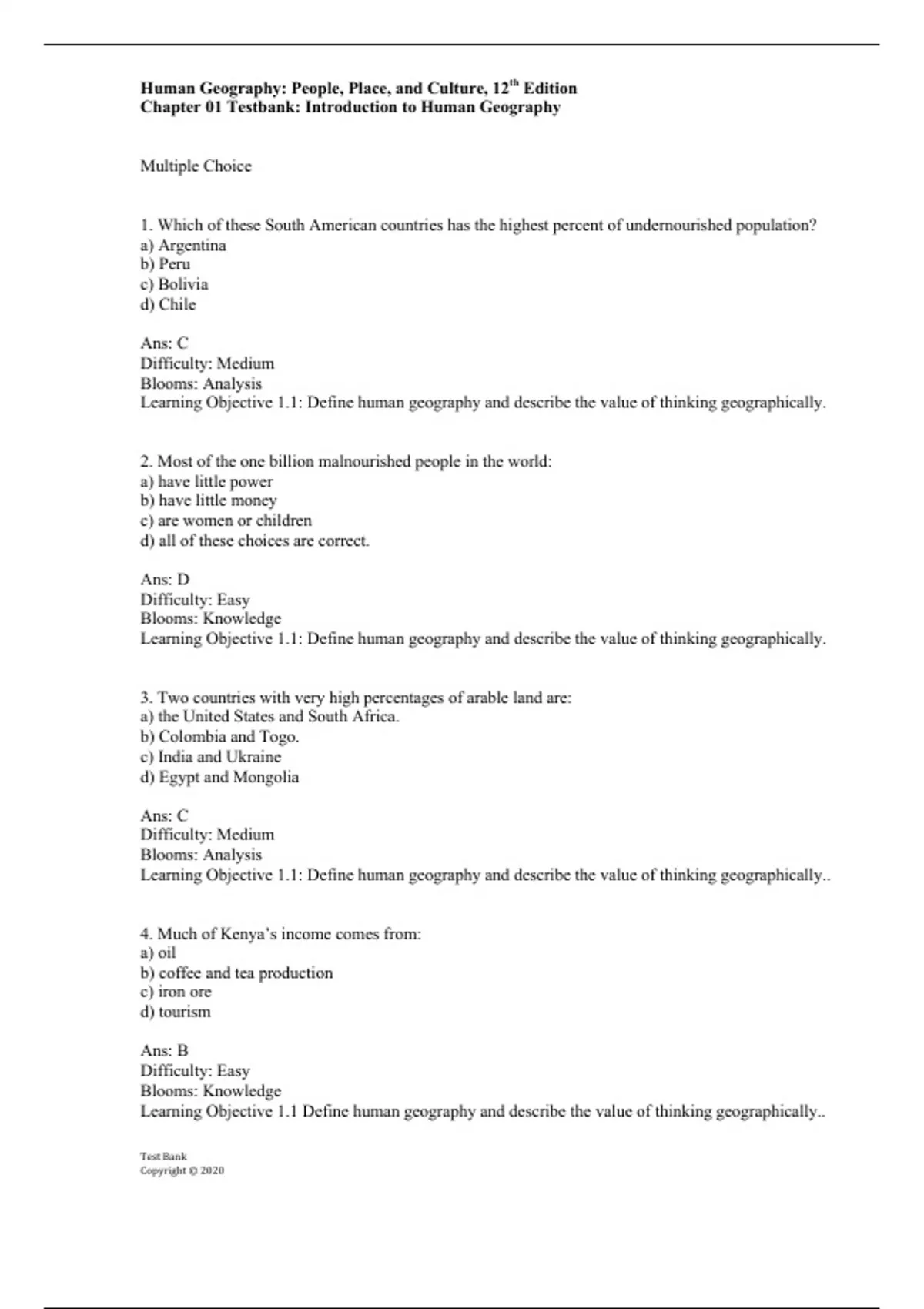 Chapter 01 Testbank: Introduction to Human Geography