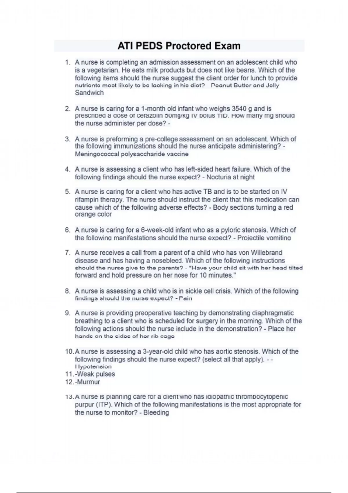 1. A nurse is completing an admission assessment on an adolescent child who is a vegetarian. He eats milk products but does not like beans. Which of the following items should the nurse suggest the client order for lunch to provide nutrients most likely to be lacking in his diet? - Peanut Butter and Jelly Sandwich 2. A nurse is caring for a 1-month old infant who weighs 3540 g and is prescribed a dose of cefazolin 50mg/kg IV bolus TID. How many mg should the nurse administer per dose? - 3. A nurse is preforming a pre-college assessment on an adolescent. Which of the following immunizations should the nurse anticipate administering? - Meningococcal polysaccharide vaccine 4. A nurse is assessing a client who has left-sided heart failure. Which of the following findings should the nurse expect? - Nocturia at night 5. A nurse is caring for a client who has active TB and is to be started on IV rifampin therapy. The nurse should instruct the client that this medication can cause which of the following adverse effects? - Body sections turning a red orange color 6. A nurse is caring for a 6-week-old infant who as a pyloric stenosis. Which of the following manifestations should the nurse expect? - Projectile vomiting 7. A nurse receives a call from a parent of a child who has von Willebrand disease and has having a nosebleed. Which of the following instructions should the nurse give to the parents? - "Have your child sit with her head tilted forward and hold pressure on her nose for 10 minutes." 8. A nurse is assessing a child who is in sickle cell crisis. Which of the following findings should the nurse expect? - Pain 9. A nurse is providing preoperative teaching by demonstrating diaphragmatic breathing to a client who is scheduled for surgery in the morning. Which of the following actions should the nurse include in the demonstration? - Place her hands on the sides of her rib cage 10. A nurse is assessing a 3-year-old child who has aortic stenosis. Which of the following findings should the nurse expect? (select all that apply). - - Hypotension 11. -Weak pulses 12. -Murmur 13. A nurse is planning care for a client who has idiopathic thrombocytopenic purpur (ITP). Which of the following manifestations is the most appropriate for the nurse to monitor? - Bleeding 14. A nurse is providing teaching to a parent of a child who has Hirschsprung disease is scheduled for initial surgery. Which of the following statements indicates an understanding of the teaching? - I'm glad that my child's ostomy is only temporary 15. A school nurse identifies that a child has pediculosis capitis and educates the child's parents about the condition. Which of the following statements by the parents indicated an understanding of the teaching? - All recently used clothing, bedding, and towels must be washed in hot water. 16. A nurse is providing dietary teaching to the parents of a newborn who is being breastfed. The nurse should instruct that the transition to whole milk can occur at which of the following ages? - 12 months 17. A nurse is assessing a 6-month old patient at a well-child visit. Which of the following findings should the nurse expect? - Closed posterior fontanel 18. A nurse is caring for a 2-year old child who has seizures and is receiving phenytoin in suspension form. Which of the following actions should the nurse take before administering each dose? - Shake the container vigorously. 19. A nurse is planning care for a female client who has a T4 spinal cord injury and is at risk for acquiring urinary tract infections. Which of the following actions should the nurse include in the client's plan of care? - Obtain a order for an in and out catheter 20. A nurse is planning care for a child who has suspected epiglottis. Which of the following actions should the nurse take? - Place the child on droplet precautions 21. A nurse is instructing a group of clients regarding calcium rich food. Which of the following should the nurse include in the teaching as the best source of calcium? - 1 cup of milk 22. A nurse is caring for an 8-month-old infant who screams when the parent leaves the room. The parent begins to cry and says " I don't understand why my child is so upset. I've never seen my child act this way around others before." Which of the following statements should the nurse make? - This is a normal, expected reaction for a child of this age 23. A nurse is caring for a 4-year-old child who is resistant to taking medication. Which of the following strategies should the nurse use to elicit the child's cooperation? - Offer the child a choice of crushed pills or elixir 24. A nurse is caring for a client who requires droplet precautions. Which of the following personal protective equipment should the nurse wear when setting up the meal tray? - Mask 25. A nurse is teaching a client who has asthma about how to use an albuterol inhaler. Which of the following actions by the client indicates an understanding of the teaching? - The client holds his breath for 10 seconds after inhaling the medication. 26. A nurse is caring for a 2-month-old infant who is post-operative following surgical repair of a cleft lip. Which of the following actions should the nurse take? - Encourage the parents to rock the infant 27. A nurse is caring for a child who has Kawasaki disease. Which of the following systems should the nurse monitor in response to this diagnosis? - Cardiovascular 28. A nurse is providing teaching to a client who has oral candidiasis and a new script for nystatin suspension. Which of the following statements by the client indicates an understanding of the teaching? - "I will store the medication at room temperature" 29. A nurse is assessing a client who has diabetes mellitus and reports foot pain. The nurse should evaluate the client for which of the following alterations as indications that the client has an infection? (Select all that apply). - -An increase in neutrophils 30. -Localized edema 31. A nurse is removing P