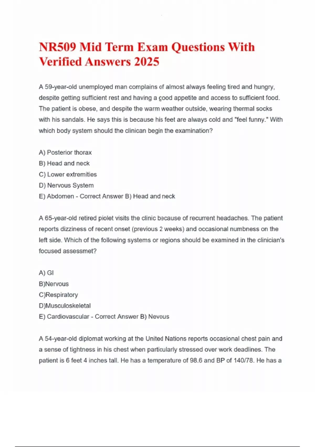 NR509 Mid Term Exam Questions With Verified Answers 2025 A 59-year-old unemployed man complains of almost always feeling tired and hungry, despite getting sufficient rest and having a good appetite and access to sufficient food. The patient is obese, and despite the warm weather outside, wearing thermal socks with his sandals. He says this is because his feet are always cold and "feel funny." With which body system should the clinican begin the examination? A) Posterior thorax B) Head and neck C) Lower extremities D) Nervous System E) Abdomen - Correct Answer B) Head and neck A 65-year-old retired piolet visits the clinic because of recurrent headaches. The patient reports dizziness of recent onset (previous 2 weeks) and occasional numbness on the left side. Which of the following systems or regions should be examined in the clinician's focused assessmet? A) GI B)Nervous C)Respiratory D)Musculoskeletal E) Cardiovascular - Correct Answer B) Nevous A 54-year-old diplomat working at the United Nations reports occasional chest pain and a sense of tightness in his chest when particularly stressed over work deadlines. The patient is 6 feet 4 inches tall. He has a temperature of 98.6 and BP of 140/78. He has a cut over one eye that he says is "from shaving." Which of the following represents subjective information about this patient?