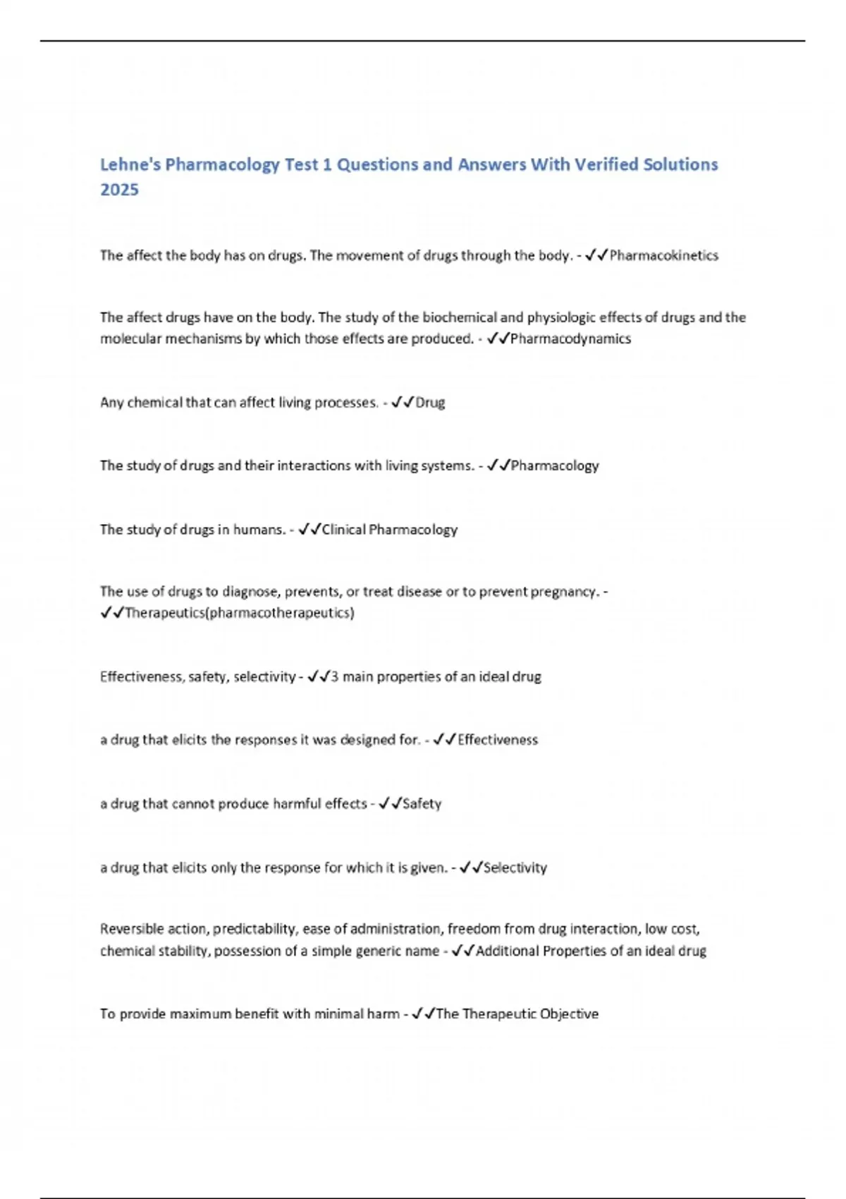 Lehne's Pharmacology Test 1 Questions and Answers With Verified Solutions 2025