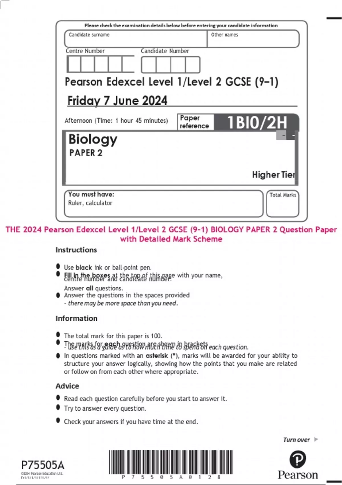THE 2024 Pearson Edexcel Level 1/Level 2 GCSE (9–1) BIOLOGY PAPER 2 Question Paper with Detailed Mark Scheme