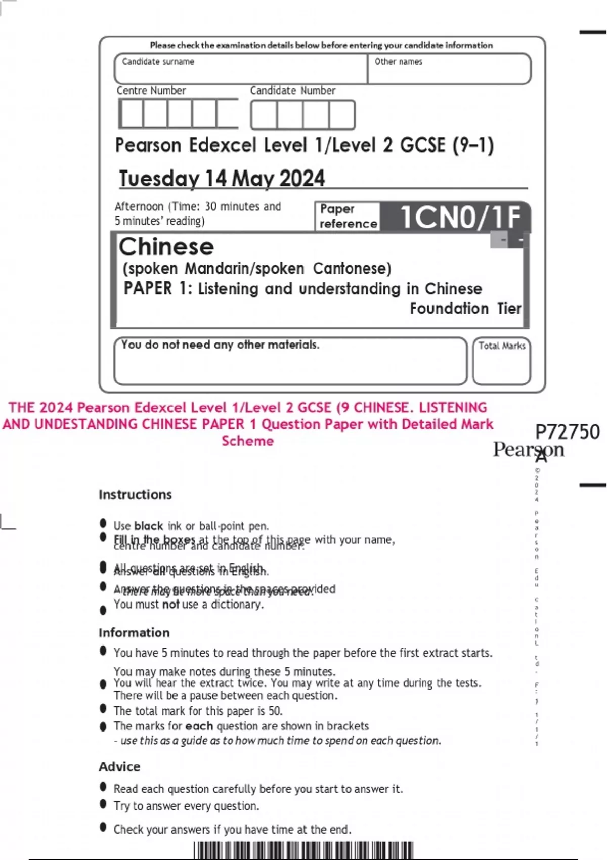 THE 2024 Pearson Edexcel Level 1/Level 2 GCSE (9 CHINESE. LISTENING AND UNDESTANDING CHINESE PAPER 1 Question Paper with Detailed Mark Scheme