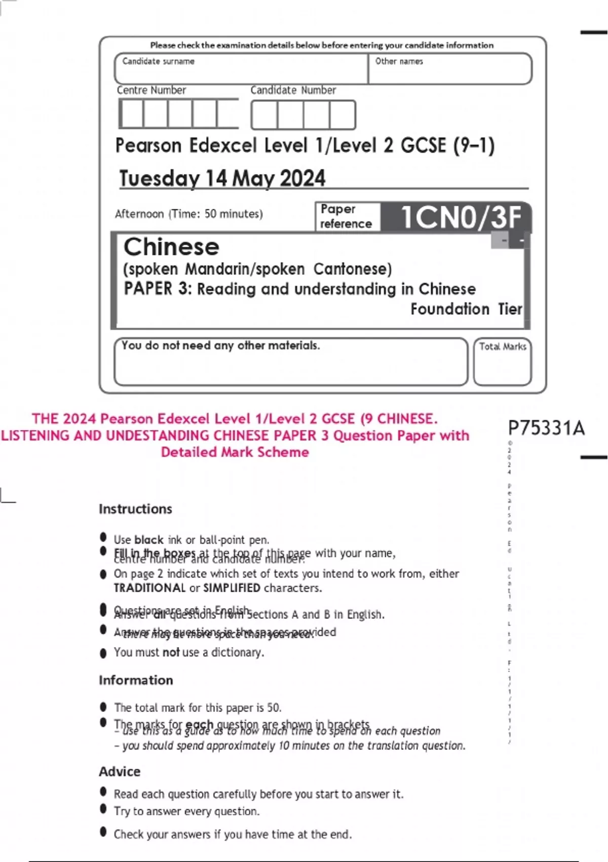 THE 2024 Pearson Edexcel Level 1/Level 2 GCSE (9 CHINESE. LISTENING AND UNDESTANDING CHINESE PAPER 3 Question Paper with Detailed Mark Scheme