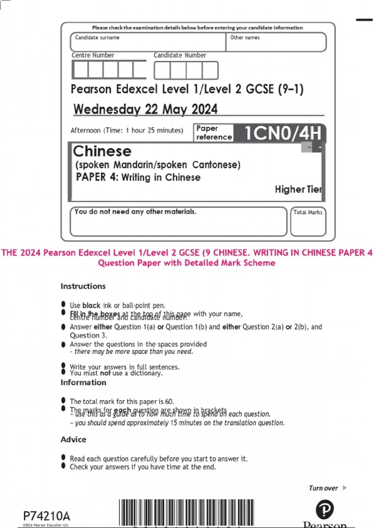 THE 2024 Pearson Edexcel Level 1/Level 2 GCSE (9 CHINESE. WRITING IN CHINESE PAPER 4 Question Paper with Detailed Mark Scheme
