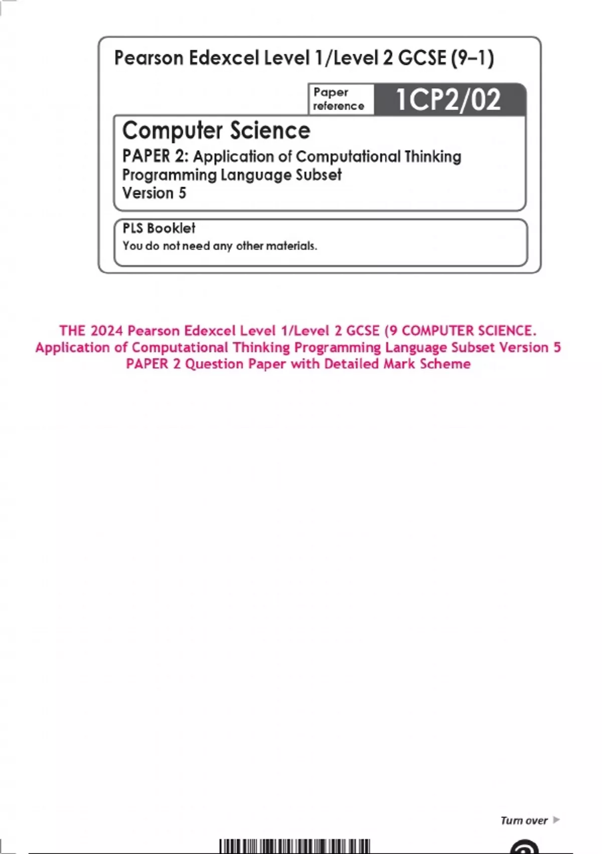THE 2024 Pearson Edexcel Level 1/Level 2 GCSE (9 COMPUTER SCIENCE. Application of Computational Thinking Programming Language Subset Version 5 PAPER 2 Question Paper with Detailed Mark Scheme