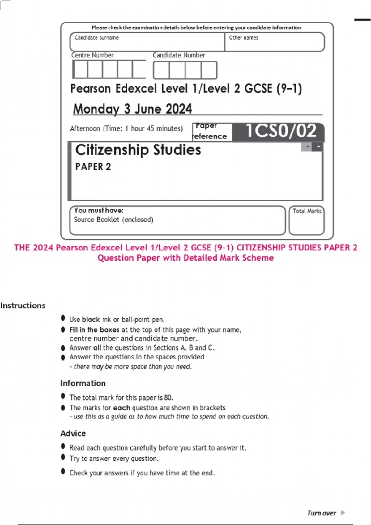 THE 2024 Pearson Edexcel Level 1/Level 2 GCSE (9–1) CITIZENSHIP STUDIES PAPER 2 Question Paper with Detailed Mark Scheme