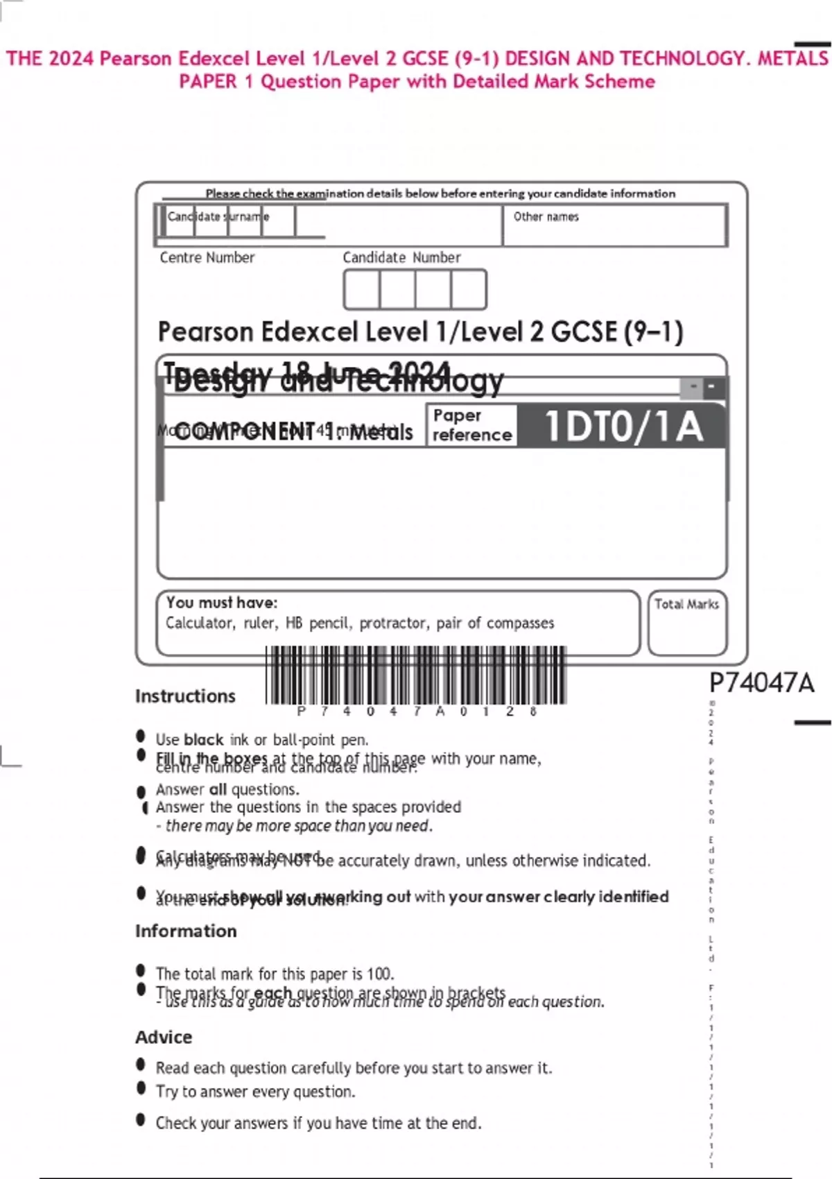 THE 2024 Pearson Edexcel Level 1/Level 2 GCSE (9–1) DESIGN AND TECHNOLOGY. METALS PAPER 1 Question Paper with Detailed Mark Scheme