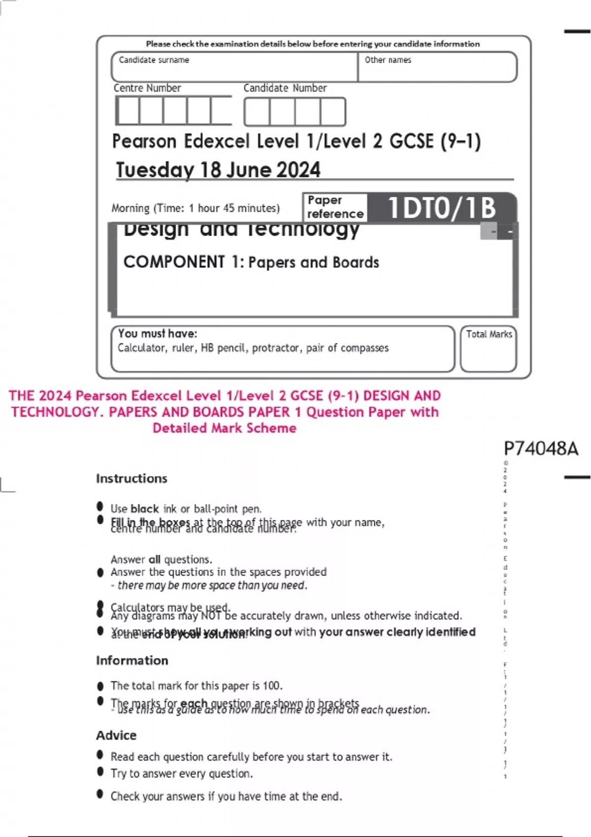 THE 2024 Pearson Edexcel Level 1/Level 2 GCSE (9–1) DESIGN AND TECHNOLOGY. PAPERS AND BOARDS PAPER 1 Question Paper with Detailed Mark Scheme