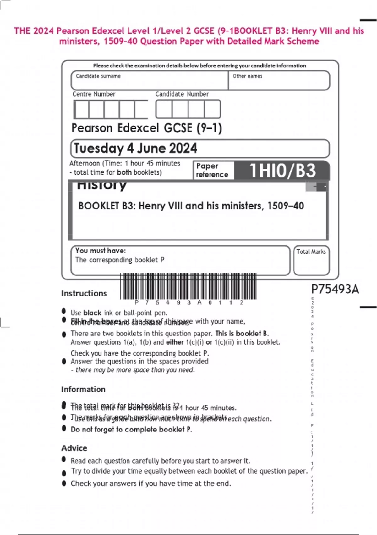 THE 2024 Pearson Edexcel Level 1/Level 2 GCSE (9–1BOOKLET B3: Henry VIII and his ministers, 1509–40 Question Paper with Detailed Mark Scheme