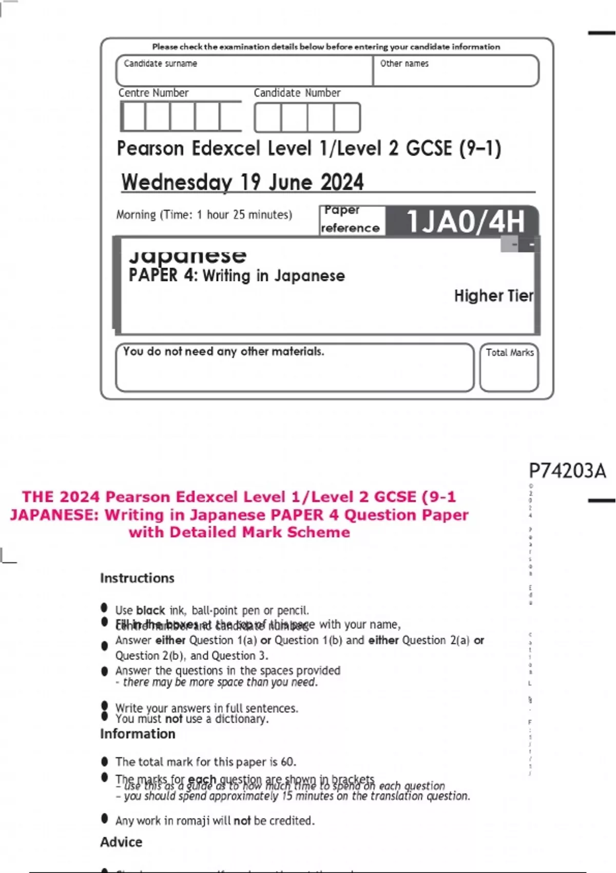 THE 2024 Pearson Edexcel Level 1/Level 2 GCSE (9-1 JAPANESE: Writing in Japanese PAPER 4 Question Paper with Detailed Mark Scheme
