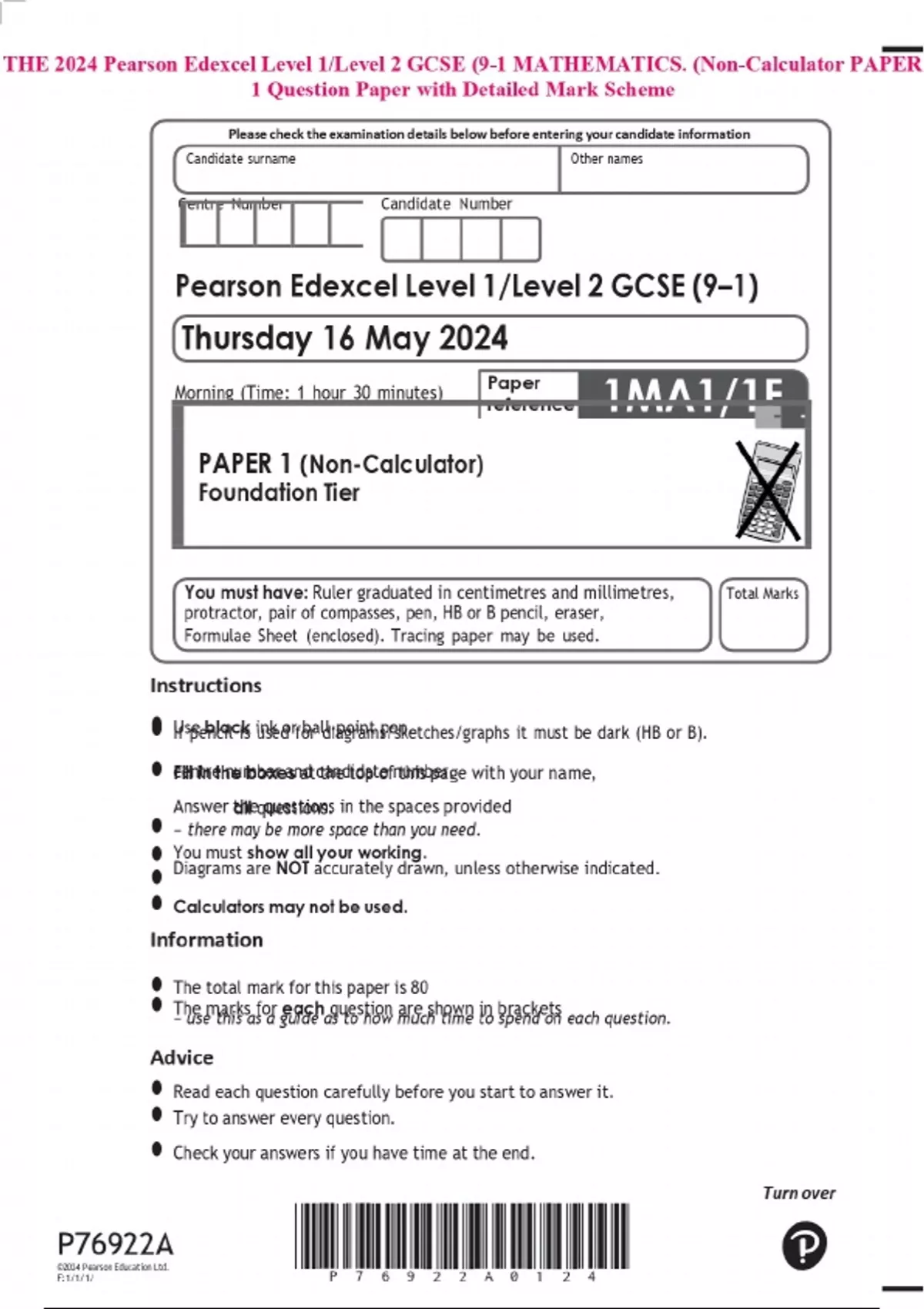 THE 2024 Pearson Edexcel Level 1/Level 2 GCSE (9-1 MATHEMATICS. (Non-Calculator PAPER 1 Question Paper with Detailed Mark Scheme