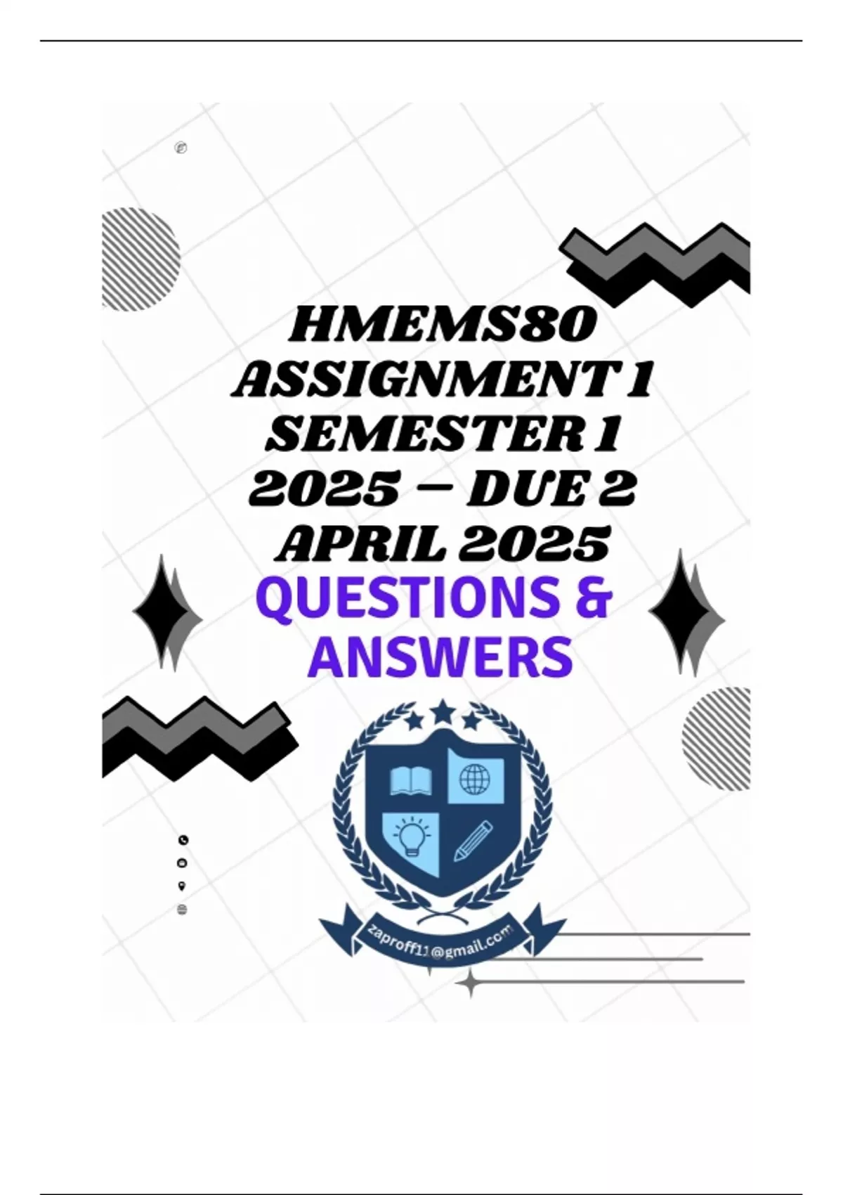 HMEMS80 ASSIGNMENT 1 SEMESTER 1 2025 – DUE 2 APRIL 2025 QUESTIONS WITH DETAILED ANSWERS Answer the following questions: Question 1: Which of the following is one of the specific outcomes for the HMEMS80 module? a) Prepare a readable, logical and professional mini-dissertation that meets university, college, departmental and supervisor(s) requirements. b) Complete an appropriate analysis of the data gathered and report on the findings. c) Demonstrate the ability to plan and apply the process of research in a research proposal of limited scope, based on given topics. d) Compile relevant conclusions and recommendations based on the findings. Question 2: HMEMS80 has two formative assignments that contribute to the year mark. Although the year mark is important; it is not enough. You still need to obtain at least 40% for the examination (POE) as a subminimum to pass. Is this statement true or false? a) True. b) False. Question 3: For the portfolio of evidence (POE) which you will be submitting later in the semester: a) You will be required to provide information from your weekly assessments. b) You will get backups of your weekly assessments on myUnisa. c) Lecturers will have copies of your weekly assessments. d) You will not be required to provide information from your weekly assessments. Question 4: Which one of the following examples is not an example of academic dishonesty practices?