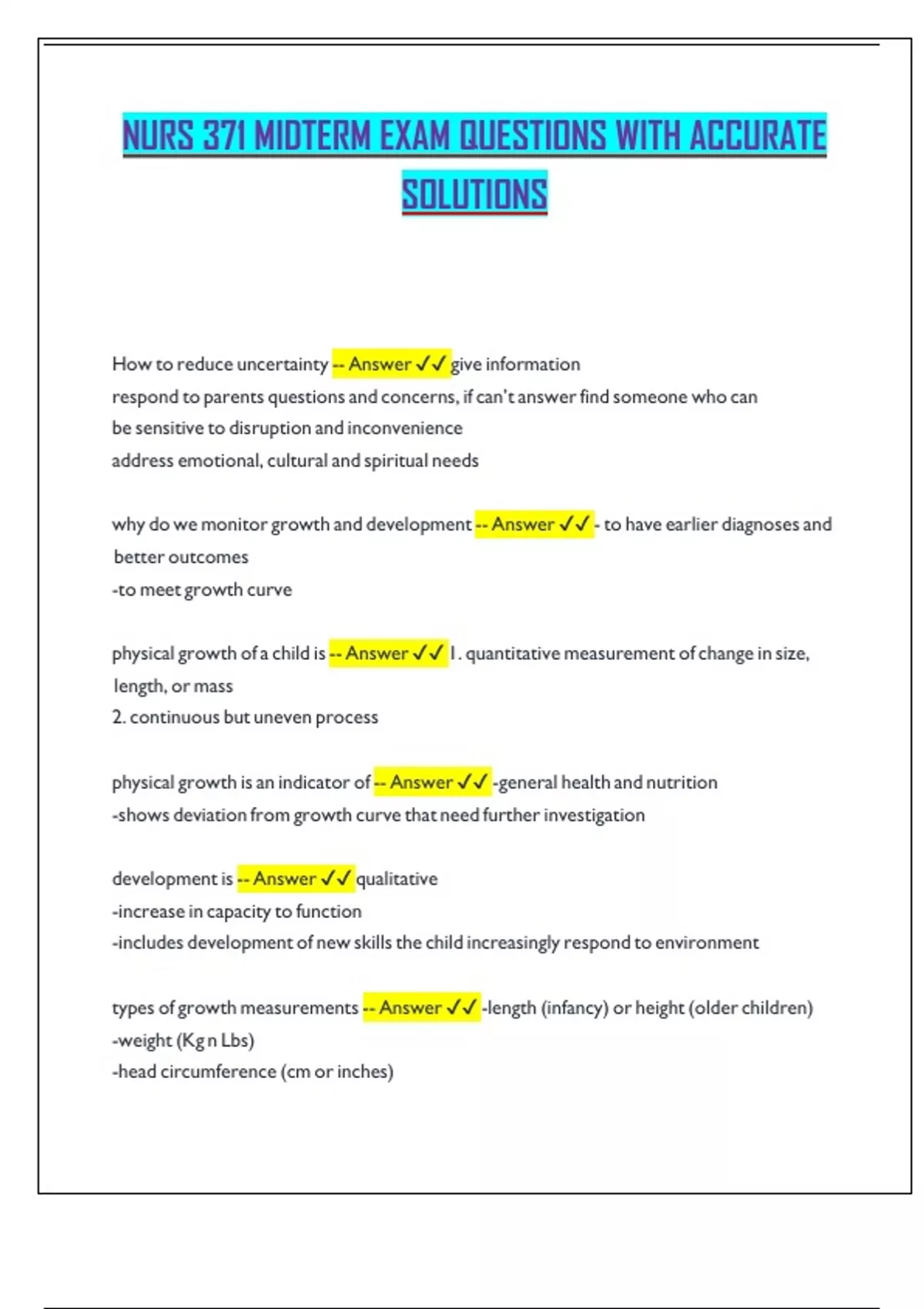 NURS 371 MIDTERM EXAM QUESTIONS WITH ACCURATE