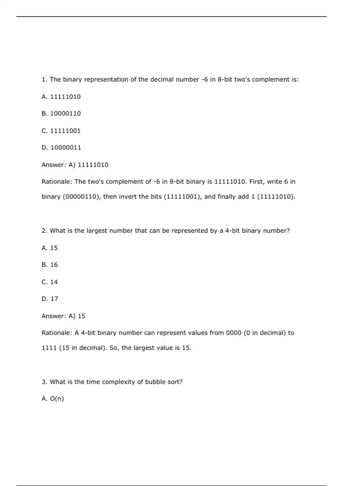 1. The binary representation of the decimal number -6 in 8-bit two's complement is: