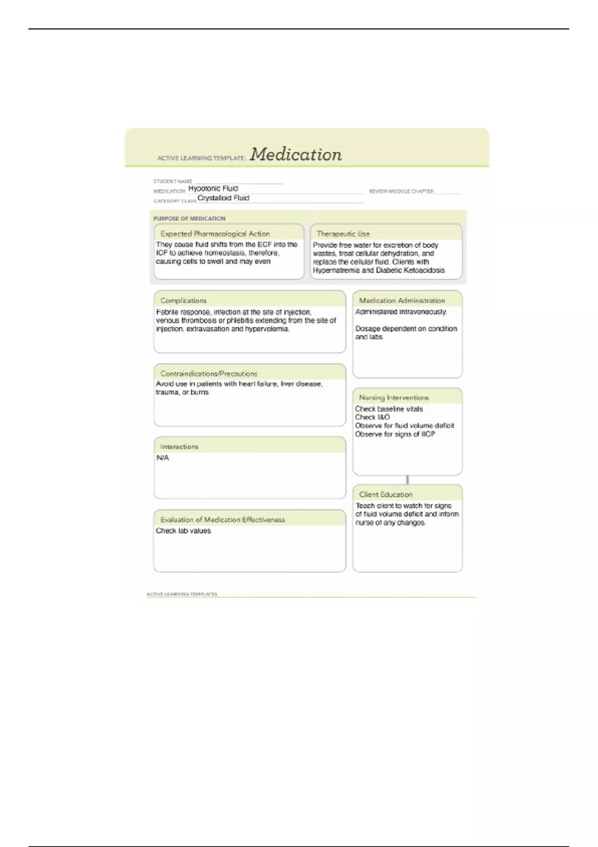 This is a comprehensive and detailed ATI medication template on;Hypotonic Fluid for RNSG 1533. An Essential Study Resource just for YOU!!