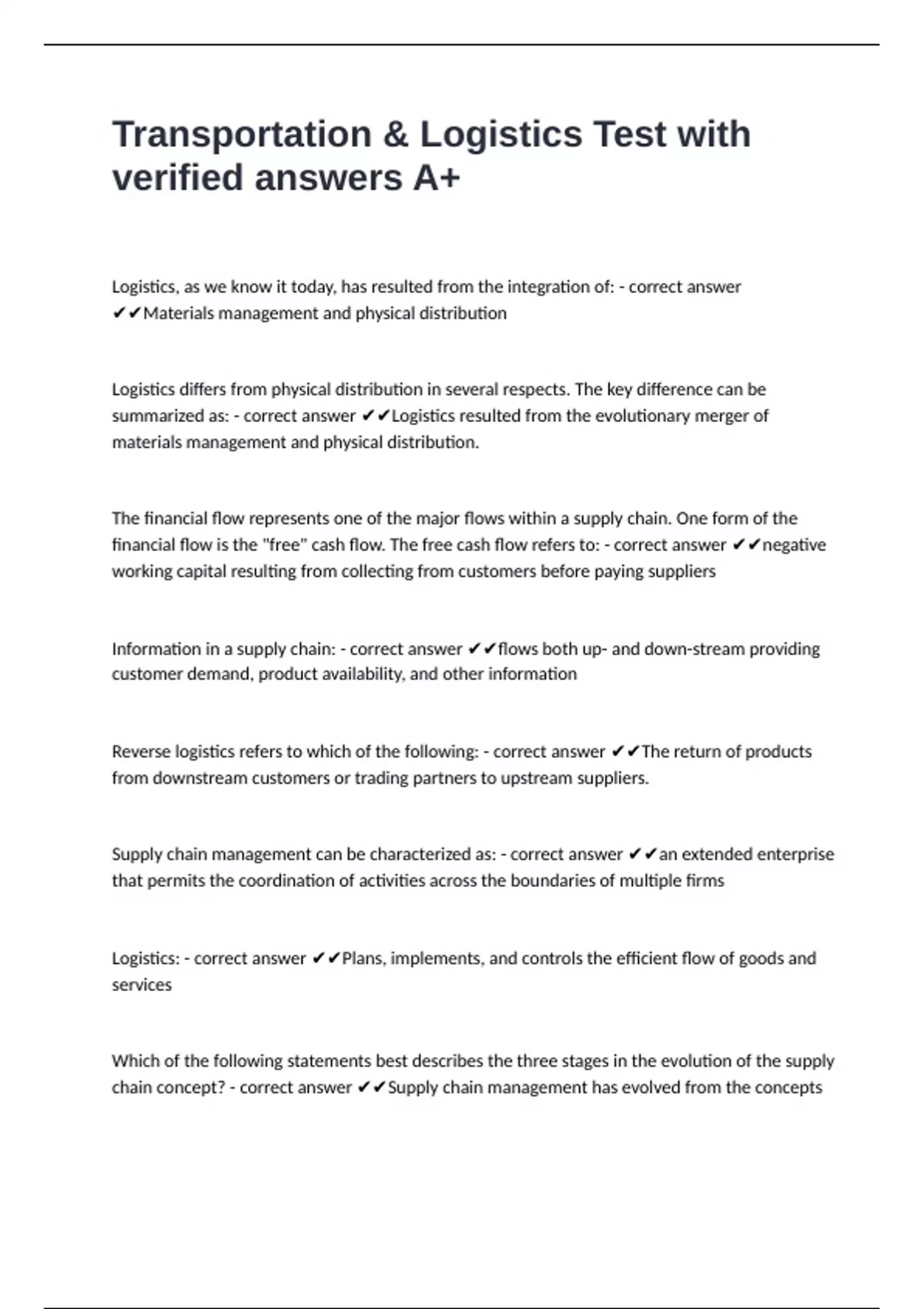 Logistics: - correct answer ✔✔Plans, implements, and controls the efficient flow of goods and